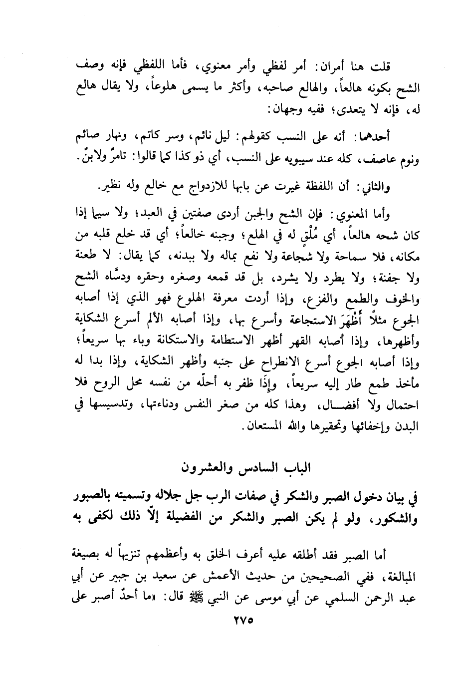 الباب السادس والعشرون: في بيان دخول الصبر والشكر في صفات الرب جل جلاله وتسميته بالصبور والشكور ولو لم يكن الصبر والشكر من الفضيلة إلا ذلك لكفى به