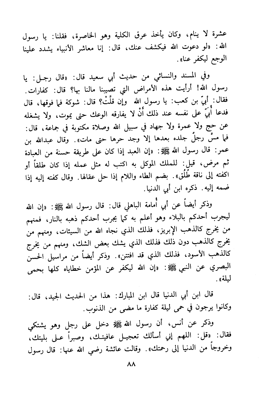 وذكر أيضا عن ابى أمامة الباهلى قال قال رسول الله: "ان الله ليجرب أحدكم بالبلاء وهو أعلم به كما يجرب أحدكم ذهبه بالنار فمنهم من يخرج كالذهب الابريز فذلك الذى نجاه الله من السيئات ومنهم من يخرج كالذهب دون ذلك فذلك الذى يشك بعض الشك ومنهم من يخرج كالذهب الأسود فذلك الذى قد أفتتن" وذكر أيضا من مراسيل الحسن البصرى عن النبي: "ان الله ليكفر عن المؤمن خطاياه كلها بحمى ليلة".