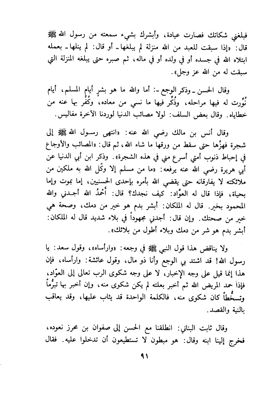 وقال أنس بن مالك رضى الله عنه: "انتهى رسول الله إلى شجرة فهزها حتى سقط من ورقها ما شاء الله ثم قال المصائب والاوجاع في إحباط ذنوب أمتى أسرع منى في هذه الشجرة" وذكر ابن أبى الدنيا عن أبى هريرة رضى الله عنه يرفعه: "ما من مسلم إلا وكل الله به ملكين من ملائكته لا يفارقانه حتى يقضى الله بأمره بإحدى الحسنيين اما بموت واما بحياة فإذا قال له العواد كيف نجدك قال أحمد الله أجدنى والله المحمود بخير قال له الملكان أبشر بدم هو خير من دمك وصحة هى خير من صحتك وان قال أجدنى مجهودا في بلاء شديد قال له الملكان ابشر بدم هو شر من دمك وبلاء أطول من بلائك".