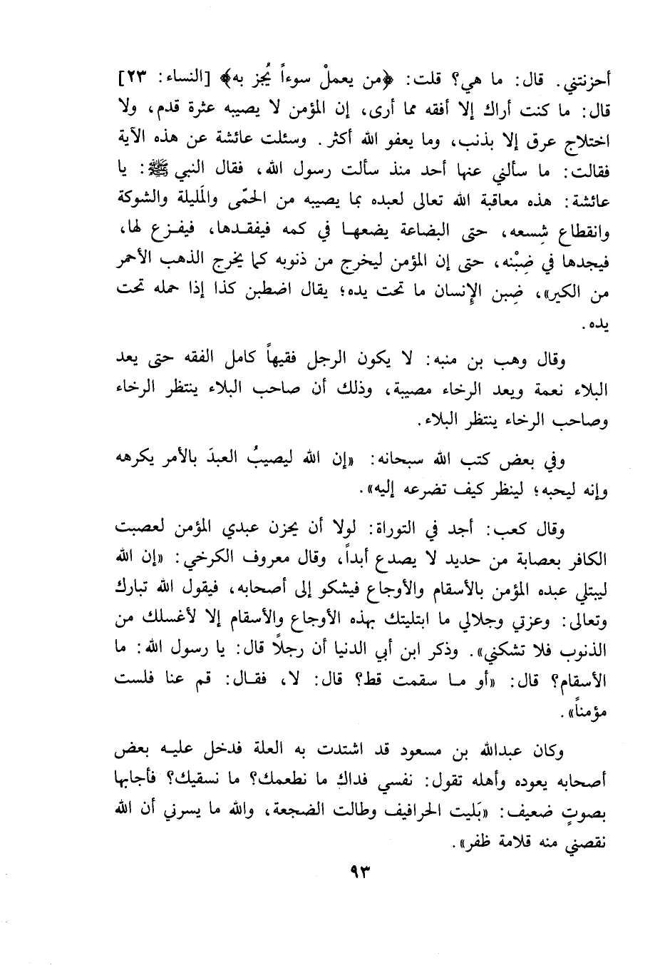 وقال كعب أجد في التوراة لولا أن يحزن عبدى المؤمن لعصبت الكافر بعصابة من حديد لا يصدع أبدا وقال معروف الكرخى ان الله ليبتلى عبده المؤمن بالأقسام والاوجام فيشكو إلى أصحابه فيقول الله تبارك وتعالى وعزتى وجلالى ما ابتليتك بهذه الاوجاع والاسقام الا لأغسلك من الذنوب فلا تشكنى وذكر ابن أبى الدنيا أن رجلا قال: "يا رسول الله ما الاسقام قال أو ما سقمت قط قال لا فقال قم عنا فلست مؤمنا".