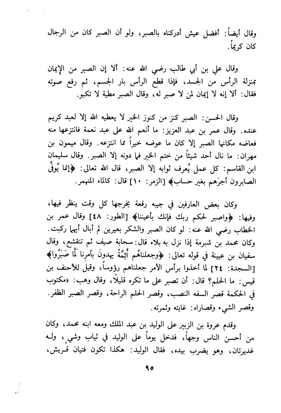 وكان بعض العارفين في جيبه رقعة يخرجها كل وقت ينظر فيها وفيها {واصبر لحكم ربك فإنك بأعيننا} وقال عمر بن الخطاب رضى الله عنه لو كان الصبر والشكر بعيرين لم أبال أيهما ركبت وكان محمد بن شبرمة إذا نزل به بلاء قال سحابة صيف ثم تنقشع وقال سفيان بن عيينة في قوله تعالى {وجعلناهم أئمة يهدون بأمرنا لما صبروا} لما أخذوا برأس الأمر جعلناهم رءوسا وقيل للأحنف بن قيس ما الحلم قال أن تصبر على ما تكره قليلا وقال وهب: "مكتوب في الحكمة قصر السفه النصب وقصر الحلم الراحة وقصر الصبر الظفر وقصر الشيء وقصاراه غايته وثمرته".