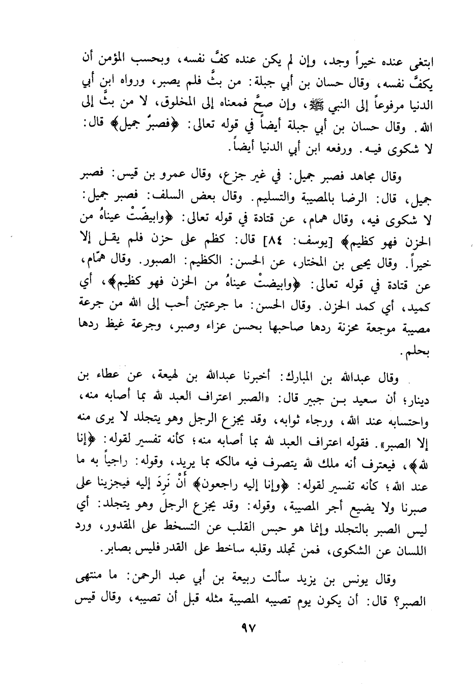ابتغى عنده خيرا وجد وان لم يكن عنده كف نفسه وبحسب المؤمن أن يكف نفسه وقال حسان بن أبى جبلة من بث فلم يصبر ورواه ابن أبى الدنيا مرفوعا إلى النبي وان صح فمعناه إلى المخلوق لا من بث إلى الله وقال حسان ابن أبى جبلة أيضا في قوله تعالى {فصبر جميل} قال لا شكوى فيه ورفعه ابن أبى الدنيا أيضا