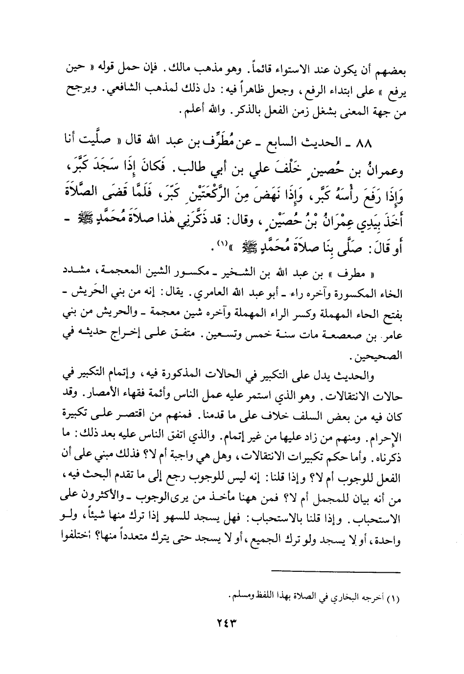 88 - الْحَدِيثُ السَّابِعُ - عَنْ مُطَرِّفِ بْنِ عَبْدِ اللَّهِ قَالَ «صَلَّيْتُ أَنَا وَعِمْرَانُ بْنُ حُصَيْنٍ خَلْفَ عَلِيِّ بْنِ أَبِي طَالِبٍ. فَكَانَ إذَا سَجَدَ كَبَّرَ، وَإِذَا رَفَعَ رَأْسَهُ كَبَّرَ، وَإِذَا نَهَضَ مِنْ الرَّكْعَتَيْنِ كَبَّرَ، فَلَمَّا قَضَى الصَّلَاةَ أَخَذَ بِيَدِي عِمْرَانُ بْنُ حُصَيْنٍ، وَقَالَ: قَدْ ذَكَّرَنِي هَذَا صَلَاةَ مُحَمَّدٍ - صَلَّى اللَّهُ عَلَيْهِ وَسَلَّمَ - أَوْ قَالَ: صَلَّى بِنَا صَلَاةَ مُحَمَّدٍ - صَلَّى اللَّهُ عَلَيْهِ وَسَلَّمَ -» .