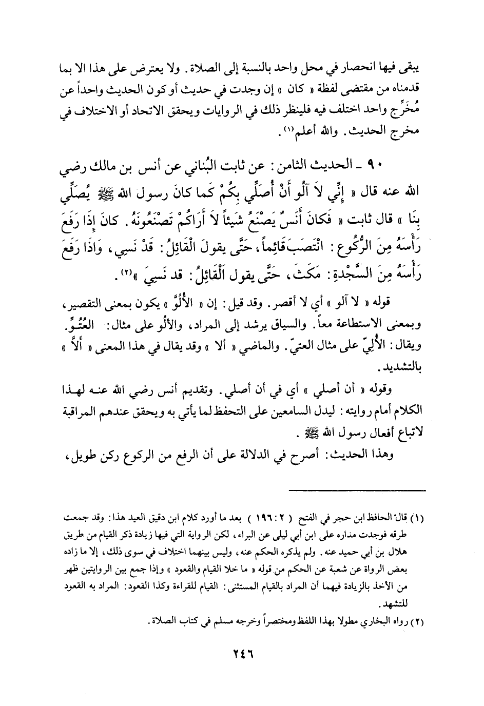 90 - الْحَدِيثُ الثَّامِنُ: عَنْ ثَابِتٍ الْبُنَانِيِّ عَنْ أَنَسِ بْنِ مَالِكٍ - رَضِيَ اللَّهُ عَنْهُ - قَالَ «إنِّي لَا آلُو أَنْ أُصَلِّيَ بِكُمْ كَمَا كَانَ رَسُولُ اللَّهِ - صَلَّى اللَّهُ عَلَيْهِ وَسَلَّمَ - يُصَلِّي بِنَا قَالَ ثَابِتٌ فَكَانَ أَنَسٌ يَصْنَعُ شَيْئًا لَا أَرَاكُمْ تَصْنَعُونَهُ. كَانَ إذَا رَفَعَ رَأْسَهُ مِنْ الرُّكُوعِ: انْتَصَبَ قَائِمًا، حَتَّى يَقُولَ الْقَائِلُ: قَدْ نَسِيَ، وَإِذَا رَفَعَ رَأْسَهُ مِنْ السَّجْدَةِ: مَكَثَ، حَتَّى يَقُولَ الْقَائِلُ: قَدْ نَسِيَ» .