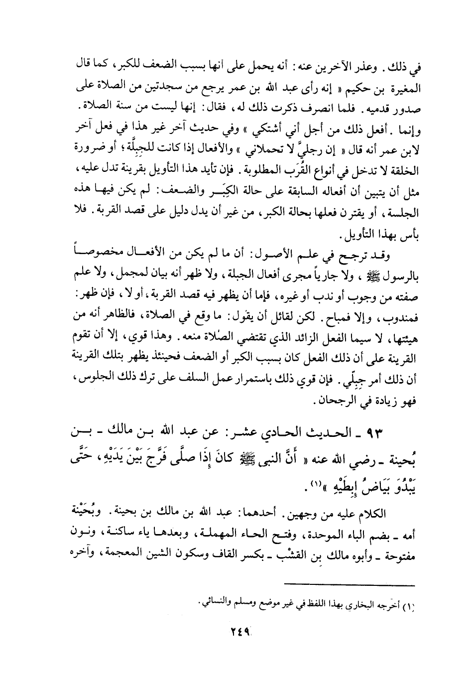 ـــــــــــــــــــــــــــــQفِي ذَلِكَ. وَعُذْرُ الْآخَرِينَ عَنْهُ: أَنَّهُ يُحْمَلُ عَلَى أَنَّهَا بِسَبَبِ الضَّعْفِ لِلْكِبَرِ، كَمَا قَالَ الْمُغِيرَةُ بْنُ حَكِيمٍ " إنَّهُ رَأَى عَبْدَ اللَّهِ بْنَ عُمَرَ يَرْجِعُ مِنْ سَجْدَتَيْنِ مِنْ الصَّلَاةِ عَلَى صُدُورِ قَدَمَيْهِ. فَلَمَّا انْصَرَفَ ذَكَرْتُ ذَلِكَ لَهُ، فَقَالَ: إنَّهَا لَيْسَتْ مِنْ سُنَّةِ الصَّلَاةِ. وَإِنَّمَا أَفْعَلُ ذَلِكَ مِنْ أَجْلِ أَنِّي أَشْتَكِي " وَفِي حَدِيثٍ آخَرَ غَيْرِ هَذَا فِي فِعْلٍ آخَرَ لِابْنِ عُمَرَ أَنَّهُ قَالَ " إنَّ رِجْلَيَّ لَا تَحْمِلَانِي " وَالْأَفْعَالُ إذَا كَانَتْ لِلْجِبِلَّةِ؛ أَوْ ضَرُورَةِ الْخِلْقَةِ لَا تَدْخُلُ فِي أَنْوَاعِ الْقُرَبِ الْمَطْلُوبَةِ. فَإِنْ تَأَيَّدَ هَذَا التَّأْوِيلُ بِقَرِينَةٍ تَدُلُّ عَلَيْهِ، مِثْلَ أَنْ يَتَبَيَّنَ أَنَّ أَفْعَالَهُ السَّابِقَةَ حَالَةَ الْكِبَرِ وَالضَّعْفِ: لَمْ يَكُنْ فِيهَا هَذِهِ الْجِلْسَةُ، أَوْ يَقْتَرِنْ فِعْلُهَا بِحَالَةِ الْكِبَرِ، مِنْ غَيْرِ أَنْ يَدُلَّ دَلِيلٌ عَلَى قَصْدِ الْقُرْبَةِ. فَلَا بَأْسَ بِهَذَا التَّأْوِيلِ. وَقَدْ تَرَجَّحَ فِي عِلْمِ الْأُصُولِ: أَنَّ مَا لَمْ يَكُنْ مِنْ الْأَفْعَالِ مَخْصُوصًا بِالرَّسُولِ - صَلَّى اللَّهُ عَلَيْهِ وَسَلَّمَ - وَلَا جَارِيًا مَجْرَى أَفْعَالِ الْجِبِلَّةِ، وَلَا ظَهَرَ أَنَّهُ بَيَانٌ لِمُجْمَلٍ، وَلَا عُلِمَ صِفَتُهُ مِنْ وُجُوبٍ أَوْ نَدْبٍ أَوْ غَيْرِهِ، فَإِمَّا أَنْ يَظْهَرَ فِيهِ قَصْدُ الْقُرْبَةِ، أَوْ لَا، فَإِنْ ظَهَرَ: فَمَنْدُوبٌ، وَإِلَّا فَمُبَاحٌ. لَكِنْ لِقَائِلٍ أَنْ يَقُولَ: مَا وَقَعَ فِي الصَّلَاةِ، فَالظَّاهِرُ أَنَّهُ مِنْ هَيْئَتِهَا، لَا سِيَّمَا الْفِعْلُ الزَّائِدُ الَّذِي تَقْتَضِي الصَّلَاةُ مَنْعَهُ. وَهَذَا قَوِيٌّ، إلَّا أَنْ تَقُومَ الْقَرِينَةُ عَلَى أَنَّ ذَلِكَ الْفِعْلَ كَانَ بِسَبَبِ الْكِبَرِ أَوْ الضَّعْفِ يَظْهَرُ بِتِلْكَ الْقَرِينَةِ أَنَّ ذَلِكَ أَمْرٌ جِبِلِّيٌّ. فَإِنْ قَوِيَ ذَلِكَ بِاسْتِمْرَارِ عَمَلِ السَّلَفِ عَلَى تَرْكِ ذَلِكَ الْجُلُوسِ، فَهُوَ زِيَادَةٌ فِي الرُّجْحَانِ.