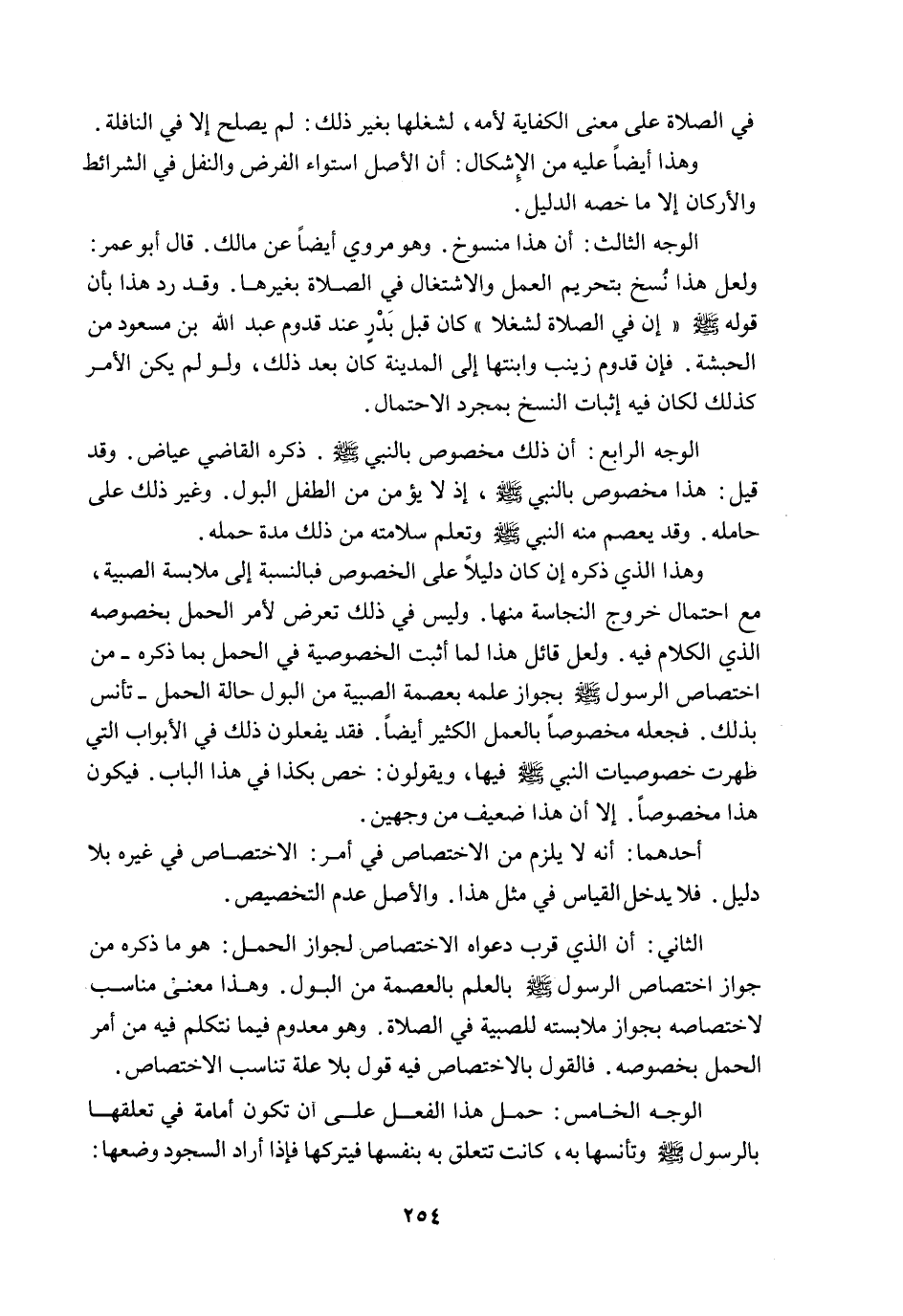 الْوَجْهُ الرَّابِعُ: أَنَّ ذَلِكَ مَخْصُوصٌ بِالنَّبِيِّ - صَلَّى اللَّهُ عَلَيْهِ وَسَلَّمَ -. ذَكَرَهُ الْقَاضِي عِيَاضٌ. وَقَدْ قِيلَ: هَذَا مَخْصُوصٌ بِالنَّبِيِّ - صَلَّى اللَّهُ عَلَيْهِ وَسَلَّمَ - إذْ لَا يُؤْمَنُ مِنْ الطِّفْلِ الْبَوْلُ وَغَيْرُ ذَلِكَ عَلَى حَامِلِهِ. وَقَدْ يُعْصَمُ مِنْهُ النَّبِيُّ - صَلَّى اللَّهُ عَلَيْهِ وَسَلَّمَ - وَتُعْلَمُ سَلَامَتُهُ مِنْ ذَلِكَ مُدَّةَ حَمْلِهِ. وَهَذَا الَّذِي ذَكَرَهُ إنْ كَانَ دَلِيلًا عَلَى الْخُصُوصِ فَبِالنِّسْبَةِ إلَى مُلَابَسَةِ الصَّبِيَّةِ، مَعَ احْتِمَالِ خُرُوجِ النَّجَاسَةِ مِنْهَا. وَلَيْسَ فِي ذَلِكَ تَعَرُّضٌ لِأَمْرِ الْحَمْلِ بِخُصُوصِهِ الَّذِي الْكَلَامُ فِيهِ. وَلَعَلَّ قَائِلَ هَذَا لَمَّا أَثْبَتَ الْخُصُوصِيَّةَ فِي الْحَمْلِ بِمَا ذَكَرَهُ - مِنْ اخْتِصَاصِ الرَّسُولِ - صَلَّى اللَّهُ عَلَيْهِ وَسَلَّمَ - بِجَوَازِ عِلْمِهِ بِعِصْمَةِ الصَّبِيَّةِ مِنْ الْبَوْلِ حَالَةَ الْحَمْلِ - تَأَنَّسَ بِذَلِكَ. فَجَعَلَهُ مَخْصُوصًا بِالْعَمَلِ الْكَثِيرِ أَيْضًا. فَقَدْ يَفْعَلُونَ ذَلِكَ فِي الْأَبْوَابِ الَّتِي ظَهَرَتْ خُصُوصِيَّاتُ النَّبِيِّ - صَلَّى اللَّهُ عَلَيْهِ وَسَلَّمَ - فِيهَا، وَيَقُولُونَ: خُصَّ بِكَذَا فِي هَذَا الْبَابِ. فَيَكُونُ هَذَا مَخْصُوصًا. إلَّا أَنَّ هَذَا ضَعِيفٌ مِنْ وَجْهَيْنِ: