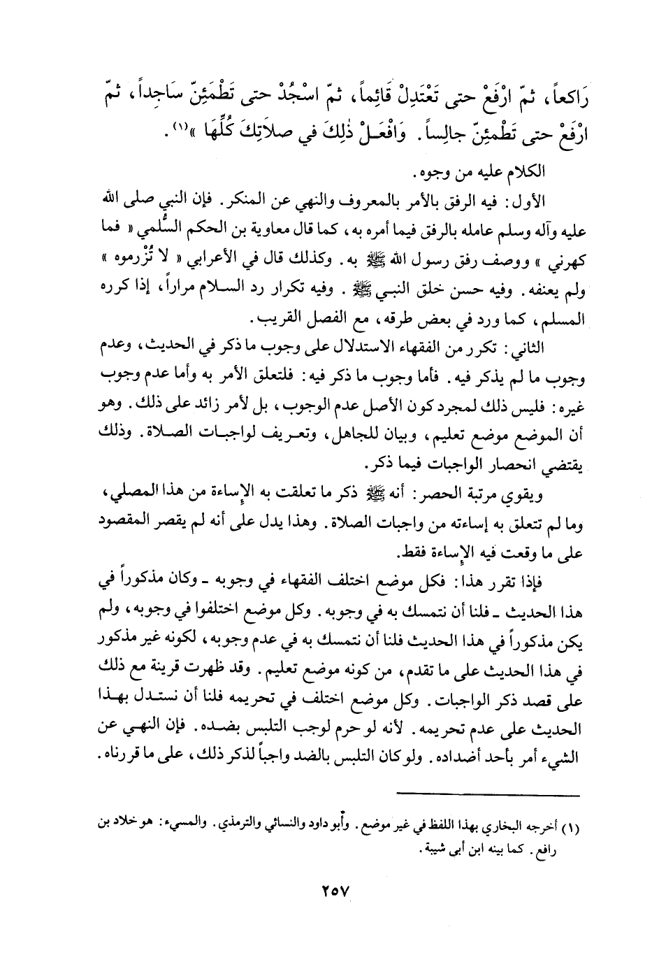 الثَّانِي: تَكَرَّرَ مِنْ الْفُقَهَاءِ الِاسْتِدْلَال عَلَى وُجُوبِ مَا ذُكِرَ فِي الْحَدِيثِ، وَعَدَمِ وُجُوبِ مَا لَمْ يُذْكَرْ فِيهِ. فَأَمَّا وُجُوبُ مَا ذُكِرَ فِيهِ: فَلِتَعَلُّقِ الْأَمْرِ بِهِ وَأَمَّا عَدَمُ وُجُوبِ غَيْرِهِ: فَلَيْسَ ذَلِكَ لِمُجَرَّدِ كَوْنِ الْأَصْلِ عَدَمَ الْوُجُوبِ، بَلْ لِأَمْرٍ زَائِدٍ عَلَى ذَلِكَ. وَهُوَ أَنَّ الْمَوْضِعَ مَوْضِعُ تَعْلِيمٍ، وَبَيَانٍ لِلْجَاهِلِ، وَتَعْرِيفٍ لِوَاجِبَاتِ الصَّلَاةِ. وَذَلِكَ يَقْتَضِي انْحِصَارَ الْوَاجِبَاتِ فِيمَا ذَكَرَ. وَيُقَوِّي مَرْتَبَةَ الْحَصْرِ: أَنَّهُ - صَلَّى اللَّهُ عَلَيْهِ وَسَلَّمَ - ذَكَرَ مَا تَعَلَّقَتْ بِهِ الْإِسَاءَةُ مِنْ هَذَا الْمُصَلِّي، وَمَا لَمْ تَتَعَلَّقْ بِهِ إسَاءَتُهُ مِنْ وَاجِبَاتِ الصَّلَاةِ. وَهَذَا يَدُلُّ عَلَى أَنَّهُ لَمْ يُقْصِرْ الْمَقْصُودَ عَلَى مَا وَقَعَتْ فِيهِ الْإِسَاءَةُ فَقَطْ. فَإِذَا تَقَرَّرَ هَذَا: فَكُلُّ مَوْضِعٍ اخْتَلَفَ الْفُقَهَاءُ فِي وُجُوبِهِ - وَكَانَ مَذْكُورًا فِي هَذَا الْحَدِيثِ - فَلَنَا أَنْ نَتَمَسَّكَ بِهِ فِي وُجُوبِهِ. وَكُلُّ مَوْضِعٍ اخْتَلَفُوا فِي وُجُوبِهِ، وَلَمْ يَكُنْ مَذْكُورًا فِي هَذَا الْحَدِيثِ قُلْنَا أَنْ نَتَمَسَّكَ بِهِ فِي عَدَمِ وُجُوبِهِ، لِكَوْنِهِ غَيْرَ مَذْكُورٍ فِي هَذَا الْحَدِيثِ عَلَى مَا تَقَدَّمَ، مِنْ كَوْنِهِ مَوْضِعَ تَعْلِيمٍ. وَقَدْ ظَهَرَتْ قَرِينَةٌ مَعَ ذَلِكَ عَلَى قَصْدِ ذِكْرِ الْوَاجِبَاتِ. وَكُلُّ مَوْضِعٍ اُخْتُلِفَ فِي تَحْرِيمِهِ فَلَنَا أَنْ نَسْتَدِلَّ بِهَذَا الْحَدِيثِ عَلَى عَدَمِ تَحْرِيمِهِ لِأَنَّهُ لَوْ حُرِّمَ لَوَجَبَ التَّلَبُّسُ بِضِدِّهِ. فَإِنَّ النَّهْيَ عَنْ الشَّيْءِ أَمْرٌ بِأَحَدِ أَضْدَادِهِ. وَلَوْ كَانَ التَّلَبُّسُ بِالضِّدِّ وَاجِبًا لَذَكَرَ ذَلِكَ، عَلَى مَا قَرَّرْنَاهُ.