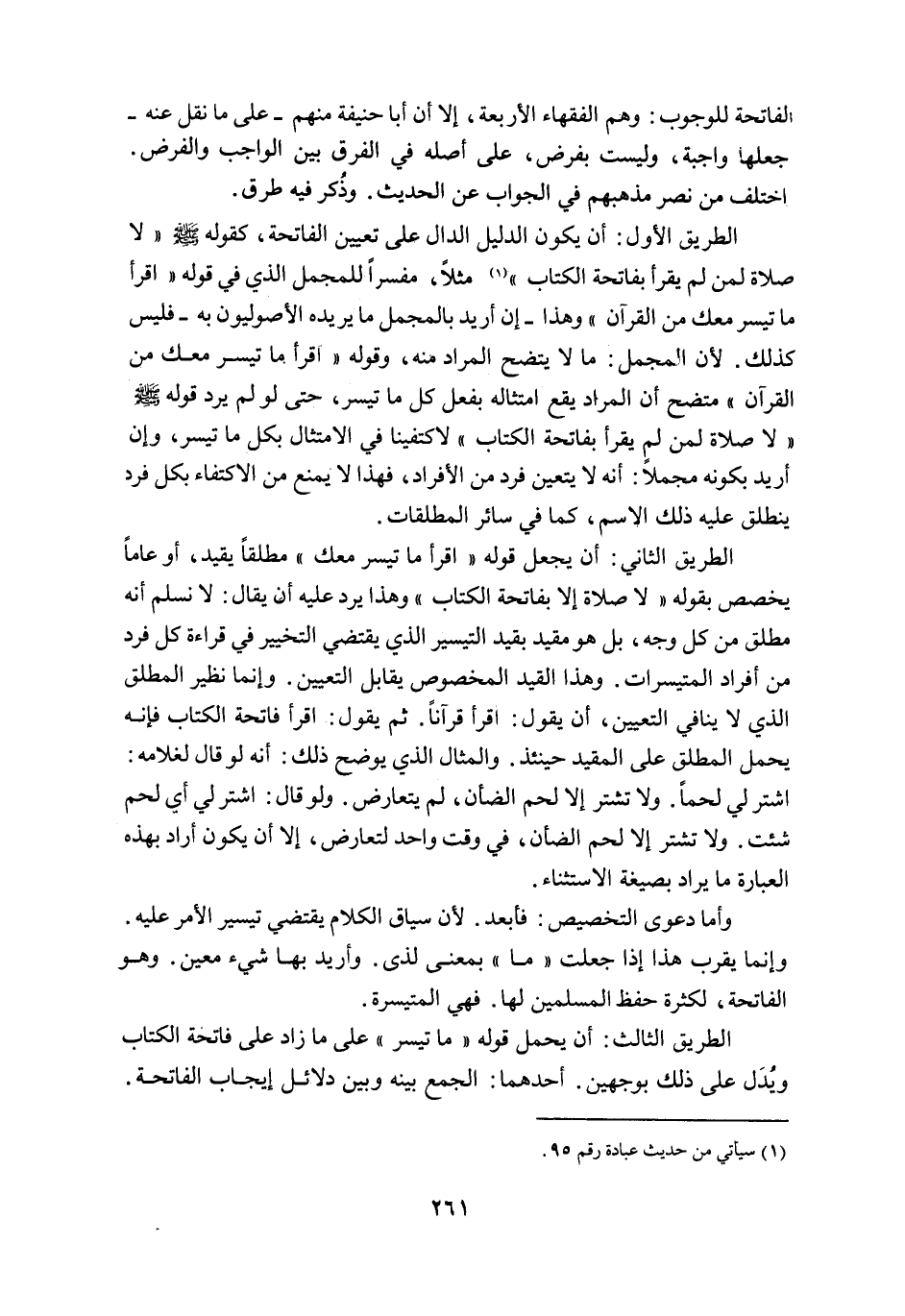 الطَّرِيقُ الْأَوَّلُ: أَنْ يَكُونَ الدَّلِيلُ الدَّالُّ عَلَى تَعْيِينِ الْفَاتِحَةِ، كَقَوْلِهِ - صَلَّى اللَّهُ عَلَيْهِ وَسَلَّمَ - «لَا صَلَاةَ لِمَنْ لَمْ يَقْرَأْ بِفَاتِحَةِ الْكِتَابِ» مَثَلًا، مُفَسِّرًا لِلْمُجْمَلِ الَّذِي فِي قَوْلِهِ «اقْرَأْ مَا تَيَسَّرَ مَعَكَ مِنْ الْقُرْآنِ» وَهَذَا - إنْ أُرِيدَ بِالْمُجْمَلِ مَا يُرِيدُهُ الْأُصُولِيُّونَ بِهِ - فَلَيْسَ كَذَلِكَ. لِأَنَّ الْمُجْمَلَ: مَا لَا يَتَّضِحُ الْمُرَادُ مِنْهُ، وَقَوْلُهُ «اقْرَأْ مَا تَيَسَّرَ مَعَكَ مِنْ الْقُرْآنِ» مُتَّضِحٌ أَنَّ الْمُرَادَ يَقَعُ امْتِثَالُهُ بِفِعْلِ كُلِّ مَا تَيَسَّرَ، حَتَّى لَوْ لَمْ يُرِدْ قَوْلَهُ - صَلَّى اللَّهُ عَلَيْهِ وَسَلَّمَ - «لَا صَلَاةَ لِمَنْ لَمْ يَقْرَأْ بِفَاتِحَةِ الْكِتَابِ» لَاكْتَفَيْنَا فِي الِامْتِثَالِ بِكُلِّ مَا تَيَسَّرَ، وَإِنْ أُرِيدَ بِكَوْنِهِ مُجْمَلًا: أَنَّهُ لَا يَتَعَيَّنُ فَرْدٌ مِنْ الْأَفْرَادِ، فَهَذَا لَا يَمْنَعُ مِنْ الِاكْتِفَاءِ بِكُلِّ فَرْدٍ يَنْطَلِقُ عَلَيْهِ ذَلِكَ الِاسْمُ، كَمَا فِي سَائِرِ الْمُطْلَقَاتِ.