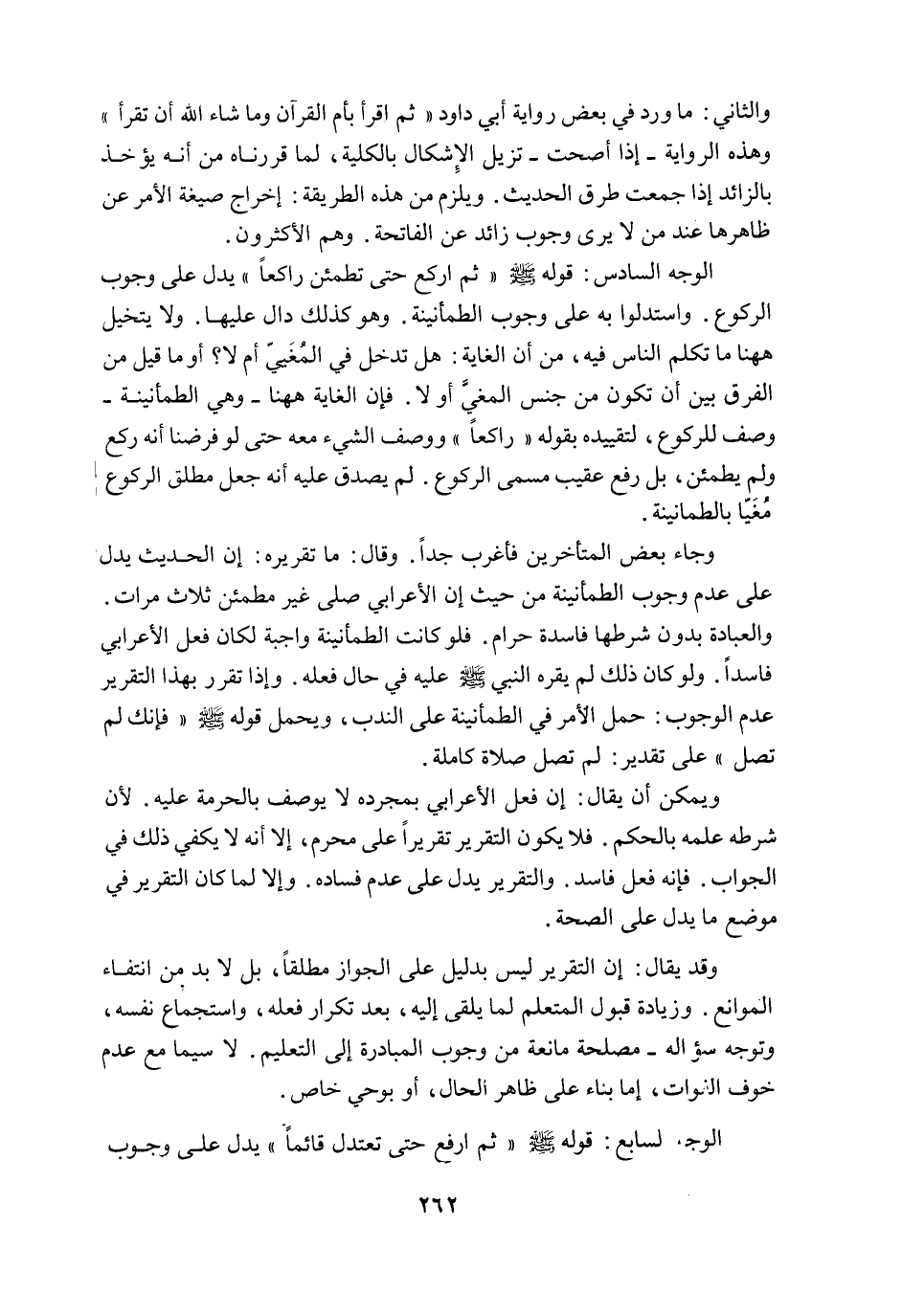 الْوَجْهُ السَّادِسُ: قَوْلُهُ - صَلَّى اللَّهُ عَلَيْهِ وَسَلَّمَ - «ثُمَّ ارْكَعْ حَتَّى تَطْمَئِنَّ رَاكِعًا» يَدُلُّ عَلَى وُجُوبِ الرُّكُوعِ. وَاسْتَدَلُّوا بِهِ عَلَى وُجُوبِ الطُّمَأْنِينَةِ. وَهُوَ كَذَلِكَ دَالٌّ عَلَيْهَا. وَلَا يُتَخَيَّلُ هَهُنَا مَا تَكَلَّمَ النَّاسُ فِيهِ، مِنْ أَنَّ الْغَايَةَ: هَلْ تَدْخُلُ فِي الْمُغَيَّا أَمْ لَا؟ أَوْ مَا قِيلَ مِنْ الْفَرْقِ بَيْنَ أَنْ تَكُونَ مِنْ جِنْسِ الْمُغَيَّا أَوْ لَا. فَإِنَّ الْغَايَةَ هَهُنَا - وَهُوَ الطُّمَأْنِينَةُ - وَصْفٌ لِلرُّكُوعِ، لِتَقْيِيدِهِ بِقَوْلِهِ " رَاكِعًا " وَوَصْفُ الشَّيْءِ مَعَهُ حَتَّى لَوْ فَرَضْنَا أَنَّهُ رَكَعَ وَلَمْ يَطْمَئِنَّ، بَلْ رَفَعَ عَقِيبَ مُسَمَّى الرُّكُوعِ. لَمْ يَصْدُقْ عَلَيْهِ أَنَّهُ جَعَلَ مُطْلَقَ الرُّكُوعِ مُغَيًّا بِالطُّمَأْنِينَةِ. وَجَاءَ بَعْضُ الْمُتَأَخِّرِينَ فَأَغْرَبَ جِدًّا. وَقَالَ: مَا تَقْرِيرُهُ: إنَّ الْحَدِيثَ يَدُلُّ عَلَى عَدَمِ وُجُوبِ الطُّمَأْنِينَةِ مِنْ حَيْثُ إنَّ الْأَعْرَابِيَّ صَلَّى غَيْرَ مُطْمَئِنٍّ ثَلَاثَ مَرَّاتٍ. وَالْعِبَادَةُ بِدُونِ شَرْطِهَا فَاسِدَةٌ حَرَامٌ. فَلَوْ كَانَتْ الطُّمَأْنِينَةُ وَاجِبَةً لَكَانَ فِعْلُ الْأَعْرَابِيِّ فَاسِدًا. وَلَوْ كَانَ ذَلِكَ لَمْ يُقِرَّهُ النَّبِيُّ - صَلَّى اللَّهُ عَلَيْهِ وَسَلَّمَ - عَلَيْهِ فِي حَالِ فِعْلِهِ. وَإِذَا تَقَرَّرَ بِهَذَا التَّقْرِيرِ عَدَمُ الْوُجُوبِ: حُمِلَ الْأَمْرُ فِي الطُّمَأْنِينَةِ عَلَى النَّدْبِ، وَيُحْمَلُ قَوْلُهُ - صَلَّى اللَّهُ عَلَيْهِ وَسَلَّمَ - " فَإِنَّكَ لَمْ تُصَلِّ " عَلَى تَقْدِيرِ: لَمْ تُصَلِّ صَلَاةً كَامِلَةً. وَيُمْكِنُ أَنْ يُقَالَ: إنَّ فِعْلَ الْأَعْرَابِيِّ بِمُجَرَّدِهِ لَا يُوصَفُ بِالْحُرْمَةِ عَلَيْهِ. لِأَنَّ شَرْطَهُ عِلْمُهُ بِالْحُكْمِ. فَلَا يَكُونُ التَّقْرِيرُ تَقْرِيرًا عَلَى مُحَرَّمٍ، إلَّا أَنَّهُ لَا يَكْفِي ذَلِكَ فِي الْجَوَابِ فَإِنَّهُ فِعْلٌ فَاسِدٌ. وَالتَّقْرِيرُ يَدُلُّ عَلَى عَدَمِ فَسَادِهِ. وَإِلَّا لَمَا كَانَ التَّقْرِيرُ فِي مَوْضِعِ مَا يَدُلُّ عَلَى الصِّحَّةِ. وَقَدْ يُقَالُ: إنَّ التَّقْرِيرَ لَيْسَ بِدَلِيلٍ عَلَى الْجَوَازِ مُطْلَقًا، بَلْ لَا بُدَّ مِنْ انْتِفَاءِ الْمَوَانِعِ. وَزِيَادَةِ قَبُولِ الْمُتَعَلِّمِ لِمَا يُلْقَى إلَيْهِ، بَعْدَ تَكْرَارِ فِعْلِهِ، وَاسْتِجْمَاعِ نَفْسِهِ، وَتَوَجُّهُ سُؤَالِهِ - مَصْلَحَةٌ مَانِعَةٌ مِنْ وُجُوبِ الْمُبَادَرَةِ إلَى التَّعْلِيمِ. لَا سِيَّمَا مَعَ عَدَمِ خَوْفِ الْفَوَاتِ، إمَّا بِنَاءً عَلَى ظَاهِرِ الْحَالِ، أَوْ بِوَحْيٍ خَاصٍّ.