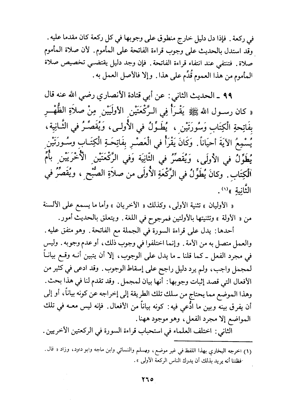 99 - الْحَدِيثُ الثَّانِي: عَنْ أَبِي قَتَادَةَ الْأَنْصَارِيِّ - رَضِيَ اللَّهُ عَنْهُ - قَالَ «كَانَ رَسُولُ اللَّهِ - صَلَّى اللَّهُ عَلَيْهِ وَسَلَّمَ - يَقْرَأُ فِي الرَّكْعَتَيْنِ الْأُولَيَيْنِ مِنْ صَلَاةِ الظُّهْرِ بِفَاتِحَةِ الْكِتَابِ وَسُورَتَيْنِ، يُطَوِّلُ فِي الْأُولَى، وَيُقَصِّرُ فِي الثَّانِيَةِ، وَيُسْمِعُ الْآيَةَ أَحْيَانًا وَكَانَ يَقْرَأُ فِي الْعَصْرِ بِفَاتِحَةِ الْكِتَابِ وَسُورَتَيْنِ يُطَوِّلُ فِي الْأُولَى، وَيُقَصِّرُ فِي الثَّانِيَةِ وَفِي الرَّكْعَتَيْنِ الْأُخْرَيَيْنِ بِأُمِّ الْكِتَابِ. وَكَانَ يُطَوِّلُ فِي الرَّكْعَةِ الْأُولَى مِنْ صَلَاةِ الصُّبْحِ، وَيُقَصِّرُ فِي الثَّانِيَةِ» .