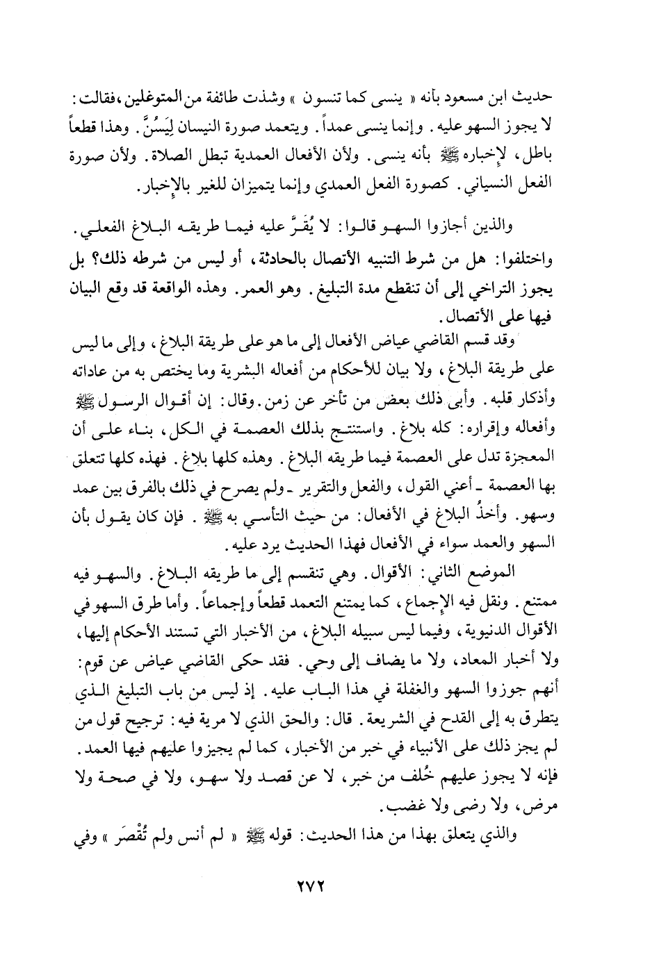 ـــــــــــــــــــــــــــــQحَدِيثِ ابْنِ مَسْعُودٍ «بِأَنَّهُ يَنْسَى كَمَا تَنْسَوْنَ» وَشَذَّتْ طَائِفَةٌ مِنْ الْمُتَوَغِّلِينَ، فَقَالَتْ: لَا يَجُوزُ السَّهْوُ عَلَيْهِ. وَإِنَّمَا يَنْسَى عَمْدًا. وَيَتَعَمَّدُ صُورَةَ النِّسْيَانِ لِيَسُنَّ. وَهَذَا قَطْعًا بَاطِلٌ، لِإِخْبَارِهِ - صَلَّى اللَّهُ عَلَيْهِ وَسَلَّمَ - بِأَنَّهُ يَنْسَى؛ وَلِأَنَّ الْأَفْعَالَ الْعَمْدِيَّةَ تُبْطِلُ الصَّلَاةَ، وَلِأَنَّ صُورَةَ الْفِعْلِ النِّسْيَانِيِّ كَصُورَةِ الْفِعْلِ الْعَمْدِيِّ، وَإِنَّمَا يَتَمَيَّزَانِ لِلْغَيْرِ بِالْإِخْبَارِ وَاَلَّذِينَ أَجَازُوا السَّهْوَ قَالُوا: لَا يُقَرُّ عَلَيْهِ فِيمَا طَرِيقُهُ الْبَلَاغُ الْفِعْلِيُّ. وَاخْتَلَفُوا: هَلْ مِنْ شَرْطِ التَّنْبِيهِ الِاتِّصَالُ بِالْحَادِثَةِ، أَوْ لَيْسَ مِنْ شَرْطِهِ ذَلِكَ؟ بَلْ يَجُوزُ التَّرَاخِي إلَى أَنْ تَنْقَطِعَ مُدَّةُ التَّبْلِيغِ، وَهُوَ الْعُمْرُ. وَهَذِهِ الْوَاقِعَةُ قَدْ وَقَعَ الْبَيَانُ فِيهَا عَلَى الِاتِّصَالِ، وَقَدْ قَسَّمَ الْقَاضِي عِيَاضٌ الْأَفْعَالَ إلَى مَا هُوَ عَلَى طَرِيقَةِ الْبَلَاغِ، وَإِلَى مَا لَيْسَ عَلَى طَرِيقَةِ الْبَلَاغِ، وَلَا بَيَانَ لِلْأَحْكَامِ مِنْ أَفْعَالِهِ الْبَشَرِيَّةِ وَمَا يَخْتَصُّ بِهِ مِنْ عَادَاتِهِ وَأَذْكَارِ قَلْبِهِ. وَأَبَى ذَلِكَ بَعْضُ مَنْ تَأَخَّرَ عَنْ زَمَنٍ. وَقَالَ: إنَّ أَقْوَالَ الرَّسُولِ - صَلَّى اللَّهُ عَلَيْهِ وَسَلَّمَ - وَأَفْعَالَهُ وَإِقْرَارَهُ: كُلَّهُ بَلَاغٌ، وَاسْتَنْتَجَ بِذَلِكَ الْعِصْمَةَ فِي الْكُلِّ، بِنَاءً عَلَى أَنَّ الْمُعْجِزَةَ تَدُلُّ عَلَى الْعِصْمَةِ فِيمَا طَرِيقُهُ الْبَلَاغُ. وَهَذِهِ كُلُّهَا بَلَاغٌ. فَهَذِهِ كُلُّهَا تَتَعَلَّقُ بِهَا الْعِصْمَةُ - أَعْنِي: الْقَوْلَ، وَالْفِعْلَ وَالتَّقْرِيرَ - وَلَمْ يُصَرِّحْ فِي ذَلِكَ بِالْفَرْقِ بَيْنَ عَمْدٍ وَسَهْوٍ. وَأَخْذِ الْبَلَاغِ فِي الْأَفْعَالِ: مِنْ حَيْثُ التَّأَسِّي بِهِ - صَلَّى اللَّهُ عَلَيْهِ وَسَلَّمَ -. فَإِنْ كَانَ يَقُولُ بِأَنَّ السَّهْوَ وَالْعَمْدَ سَوَاءٌ فِي الْأَفْعَالِ فَهَذَا الْحَدِيثُ يُرَدُّ عَلَيْهِ.