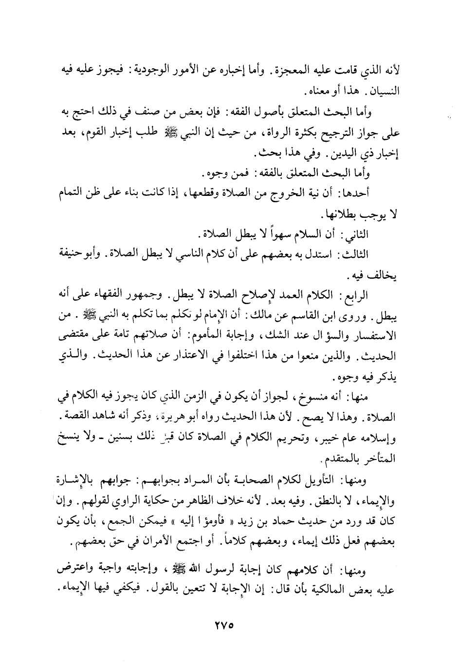 الرَّابِعُ: الْكَلَامُ الْعَمْدُ لِإِصْلَاحِ الصَّلَاةِ لَا يُبْطِلُ. وَجُمْهُورُ الْفُقَهَاءِ عَلَى أَنَّهُ يُبْطِلُ. وَرَوَى ابْنُ الْقَاسِمِ عَنْ مَالِكٍ: أَنَّ الْإِمَامَ لَوْ تَكَلَّمَ بِمَا تَكَلَّمَ بِهِ النَّبِيُّ - صَلَّى اللَّهُ عَلَيْهِ وَسَلَّمَ -. مِنْ الِاسْتِفْسَارِ وَالسُّؤَالِ عِنْدَ الشَّكِّ، وَإِجَابَةِ الْمَأْمُومِ: أَنَّ صَلَاتَهُمْ تَامَّةٌ عَلَى مُقْتَضَى الْحَدِيثِ. وَاَلَّذِينَ مَنَعُوا مِنْ هَذَا اخْتَلَفُوا فِي الِاعْتِذَارِ عَنْ هَذَا الْحَدِيثِ. وَاَلَّذِي يُذْكَرُ فِيهِ وُجُوهٌ: