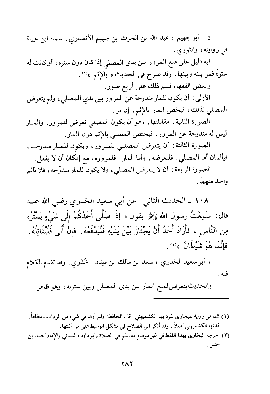 108 - الْحَدِيثُ الثَّانِي: عَنْ أَبِي سَعِيدٍ الْخُدْرِيِّ - رَضِيَ اللَّهُ عَنْهُ - قَالَ: سَمِعْتُ رَسُولَ اللَّهِ - صَلَّى اللَّهُ عَلَيْهِ وَسَلَّمَ - يَقُولُ «إذَا صَلَّى أَحَدُكُمْ إلَى شَيْءٍ يَسْتُرُهُ مِنْ النَّاسِ، فَأَرَادَ أَحَدٌ أَنْ يَجْتَازَ بَيْنَ يَدَيْهِ فَلْيَدْفَعْهُ. فَإِنْ أَبَى فَلْيُقَاتِلْهُ. فَإِنَّمَا هُوَ شَيْطَانٌ» .