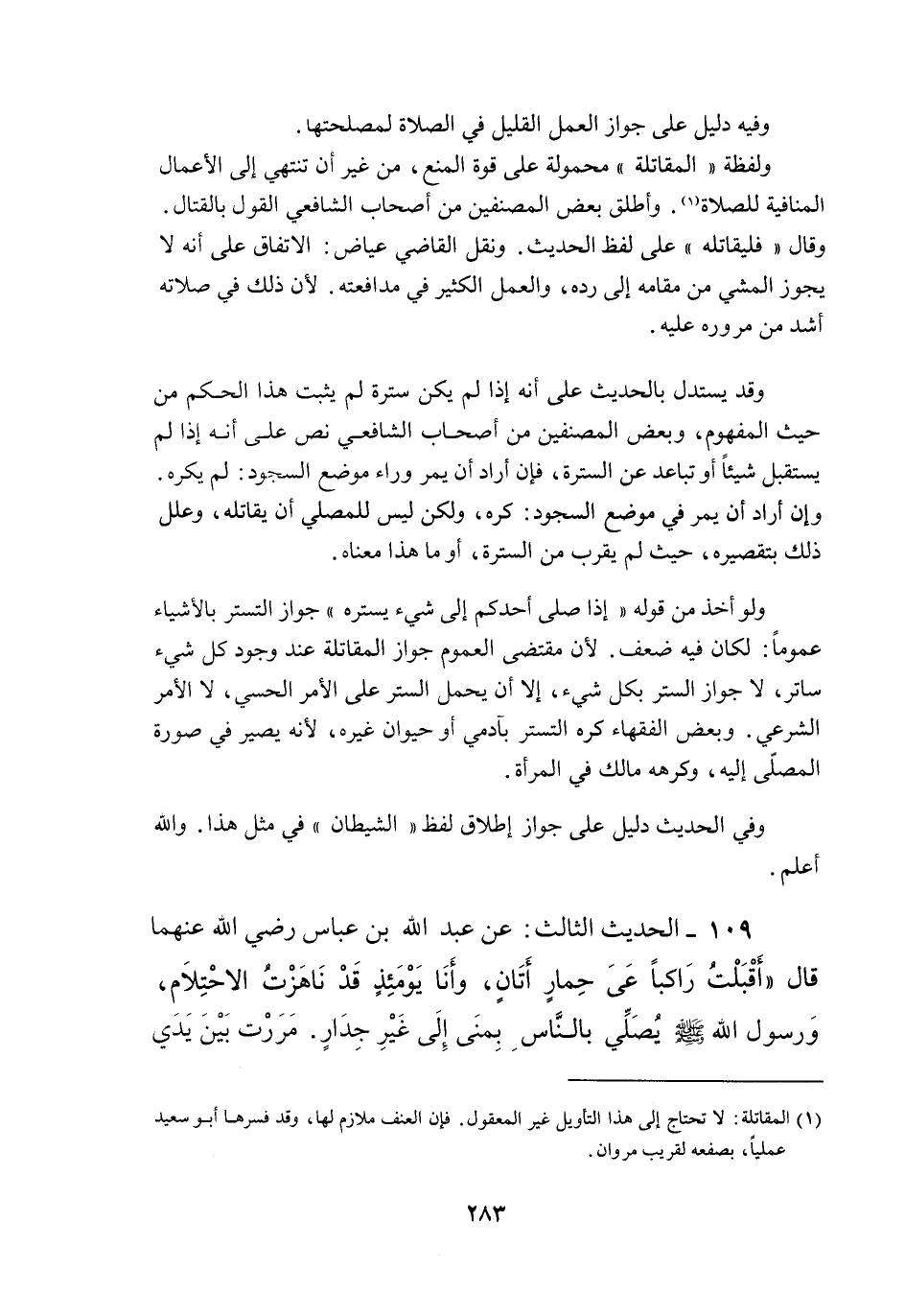 109 - الْحَدِيثُ الثَّالِثُ: عَنْ عَبْدِ اللَّهِ بْنِ عَبَّاسٍ - رَضِيَ اللَّهُ عَنْهُمَا - قَالَ «أَقْبَلْتُ رَاكِبًا عَلَى حِمَارٍ أَتَانٍ، وَأَنَا يَوْمَئِذٍ قَدْ نَاهَزْتُ الِاحْتِلَامَ، وَرَسُولُ اللَّهِ - صَلَّى اللَّهُ عَلَيْهِ وَسَلَّمَ - يُصَلِّي بِالنَّاسِ بِمِنًى إلَى غَيْرِ جِدَارٍ. مَرَرْتُ بَيْنَ يَدَيْ