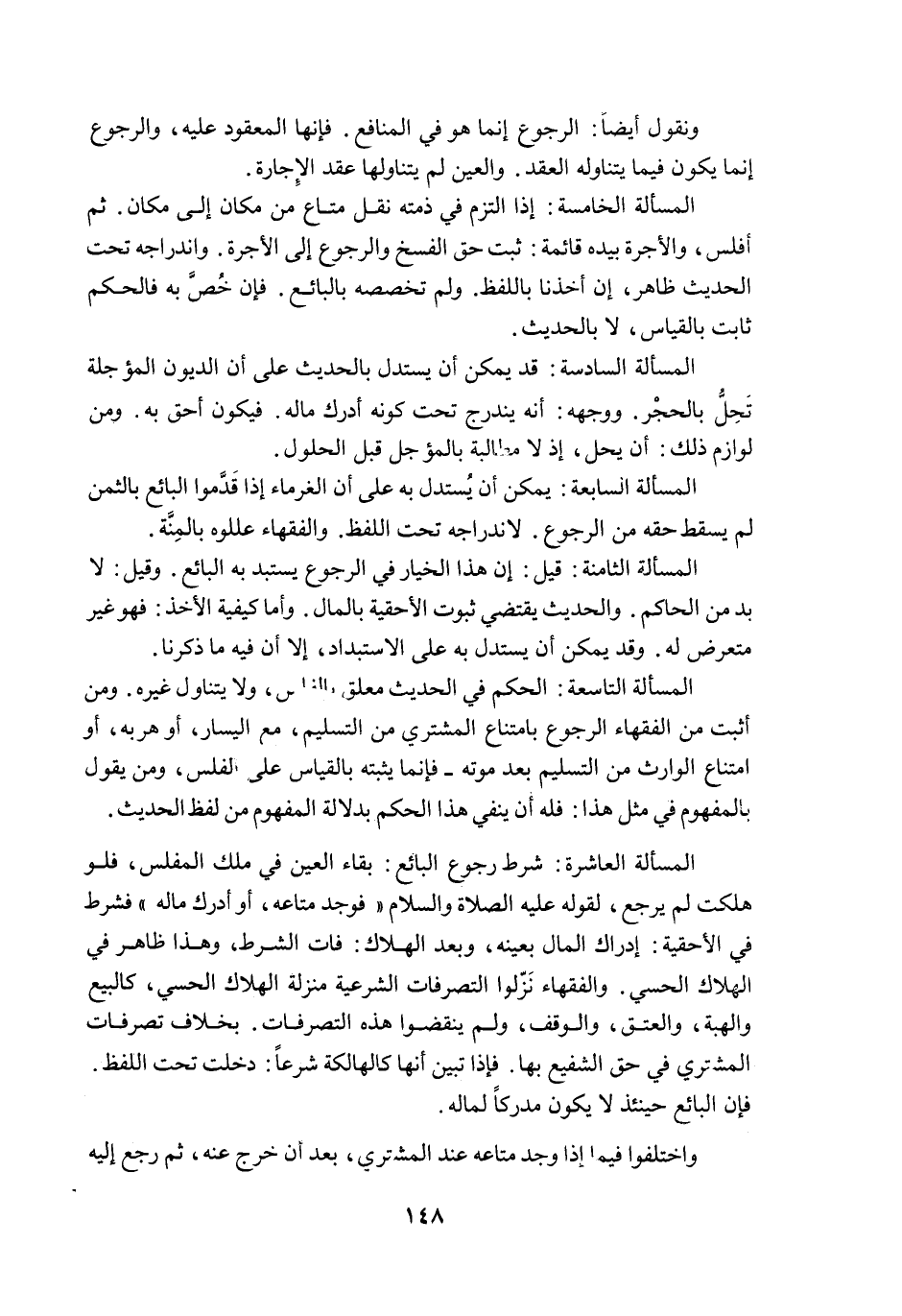 الْمَسْأَلَةُ التَّاسِعَةُ: الْحُكْمُ فِي الْحَدِيثِ مُعَلَّقٌ بِالْفَلَسِ، وَلَا يَتَنَاوَلُ غَيْرَهُ. وَمَنْ أَثْبَتَ مِنْ الْفُقَهَاءِ الرُّجُوعَ بِامْتِنَاعِ الْمُشْتَرِي مِنْ التَّسْلِيمِ، مَعَ الْيَسَارِ، أَوْ هَرَبِهِ، أَوْ امْتِنَاعِ الْوَارِثِ مِنْ التَّسْلِيمِ بَعْدَ مَوْتِهِ - فَإِنَّمَا يُثْبِتُهُ بِالْقِيَاسِ عَلَى الْفَلَسِ، وَمَنْ يَقُولُ بِالْمَفْهُومِ فِي مِثْلِ هَذَا: فَلَهُ أَنْ يَنْفِيَ هَذَا الْحُكْمَ بِدَلَالَةِ الْمَفْهُومِ مِنْ لَفْظِ الْحَدِيثِ.