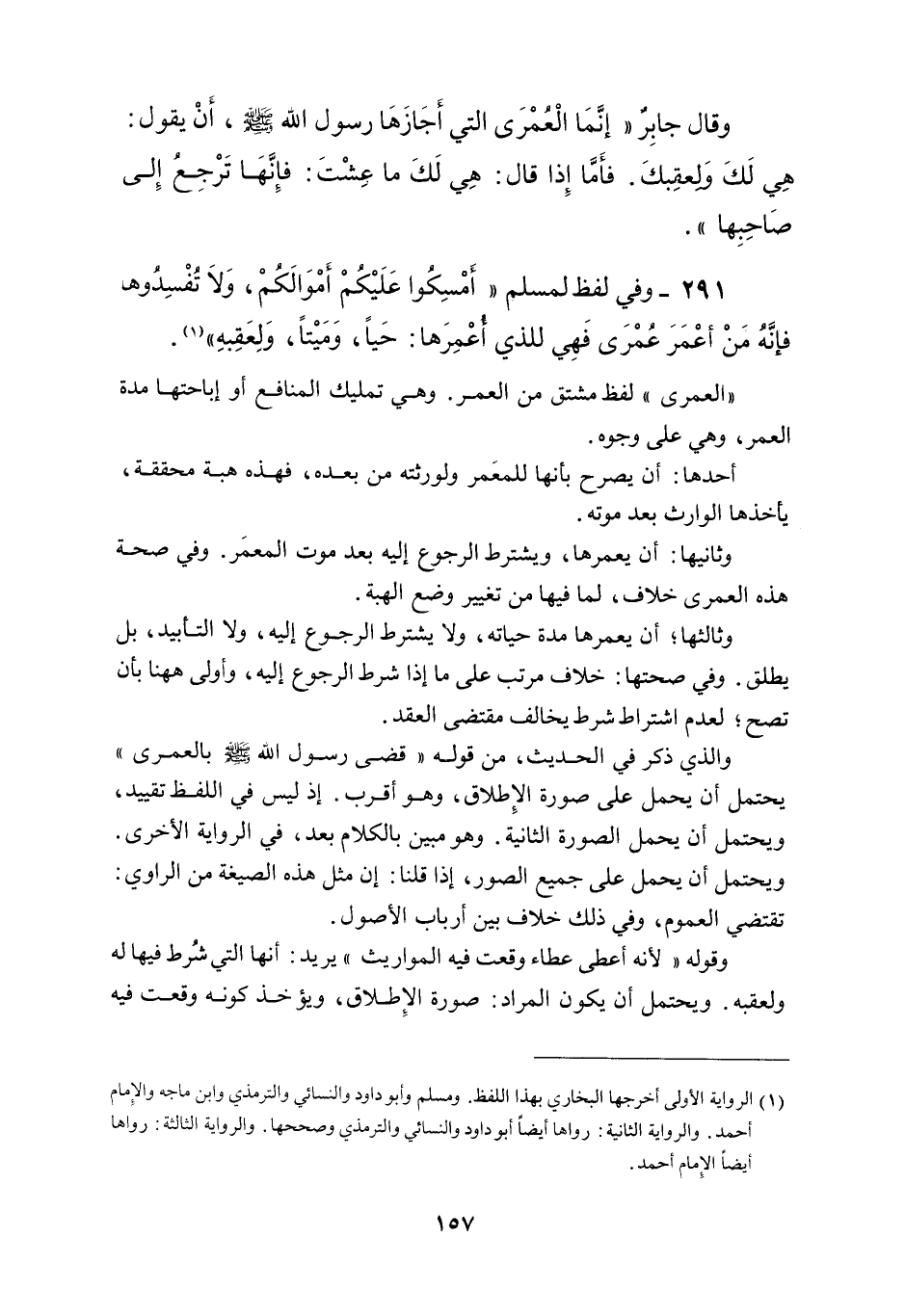 291 - وَفِي لَفْظٍ لِمُسْلِمٍ «أَمْسِكُوا عَلَيْكُمْ أَمْوَالَكُمْ، وَلَا تُفْسِدُوهَا فَإِنَّهُ مَنْ أَعْمَرَ عُمْرَى فَهِيَ لِلَّذِي أُعْمِرَهَا: حَيًّا، وَمَيِّتًا، وَلِعَقِبِهِ»