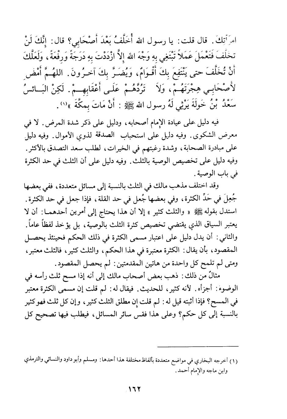 ، وَفِيهِ دَلِيلٌ عَلَى تَخْصِيصِ الْوَصِيَّةِ بِالثُّلُثِ وَفِيهِ دَلِيلٌ عَلَى أَنَّ الثُّلُثَ فِي حَدِّ الْكَثْرَةِ فِي بَابِ الْوَصِيَّةِ وَقَدْ اخْتَلَفَ مَذْهَبُ مَالِكٍ فِي الثُّلُثِ بِالنِّسْبَةِ إلَى مَسَائِلَ مُتَعَدِّدَةٍ، فَفِي بَعْضِهَا جُعِلَ فِي حَدِّ الْكَثْرَةِ، وَفِي بَعْضِهَا جُعِلَ فِي حَدِّ الْقِلَّةِ، فَإِذَا جُعِلَ فِي حَدِّ الْكَثْرَةِ اُسْتُدِلَّ بِقَوْلِهِ - صَلَّى اللَّهُ عَلَيْهِ وَسَلَّمَ - «وَالثُّلُثُ كَثِيرٌ» إلَّا أَنَّ هَذَا يَحْتَاجُ إلَى أَمْرَيْنِ أَحَدِهِمَا: أَنْ لَا يُعْتَبَرَ السِّيَاقُ الَّذِي يَقْتَضِي تَخْصِيصَ كَثْرَةِ الثُّلُثِ بِالْوَصِيَّةِ، بَلْ يُؤْخَذُ لَفْظًا عَامًّا وَالثَّانِي: أَنْ يَدُلَّ دَلِيلٌ عَلَى اعْتِبَارِ مُسَمَّى الْكَثْرَةِ فِي ذَلِكَ الْحُكْمِ فَحِينَئِذٍ يَحْصُلُ الْمَقْصُودُ، بِأَنْ يُقَالَ: الْكَثْرَةُ مُعْتَبَرَةٌ فِي هَذَا الْحُكْمِ، وَالثُّلُثُ كَثِيرٌ فَالثُّلُثُ مُعْتَبَرٌ، وَمَتَى لَمْ تُلْمَحْ كُلُّ وَاحِدَةٍ مِنْ هَاتَيْنِ الْمُقَدِّمَتَيْنِ: لَمْ يَحْصُلْ الْمَقْصُودُ.