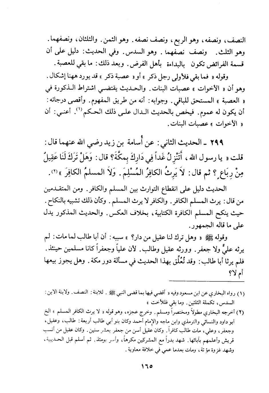 299 - الْحَدِيثُ الثَّانِي: عَنْ أُسَامَةَ بْنِ زَيْدٍ - رَضِيَ اللَّهُ عَنْهُمَا - قَالَ: «قُلْتُ يَا رَسُولَ اللَّهِ، أَتَنْزِلُ غَدًا فِي دَارِكَ بِمَكَّةَ؟ قَالَ وَهَلْ تَرَكَ لَنَا عَقِيلٌ مِنْ رِبَاعٍ؟ ثُمَّ قَالَ: لَا يَرِثُ الْكَافِرُ الْمُسْلِمَ وَلَا الْمُسْلِمُ الْكَافِرَ»
