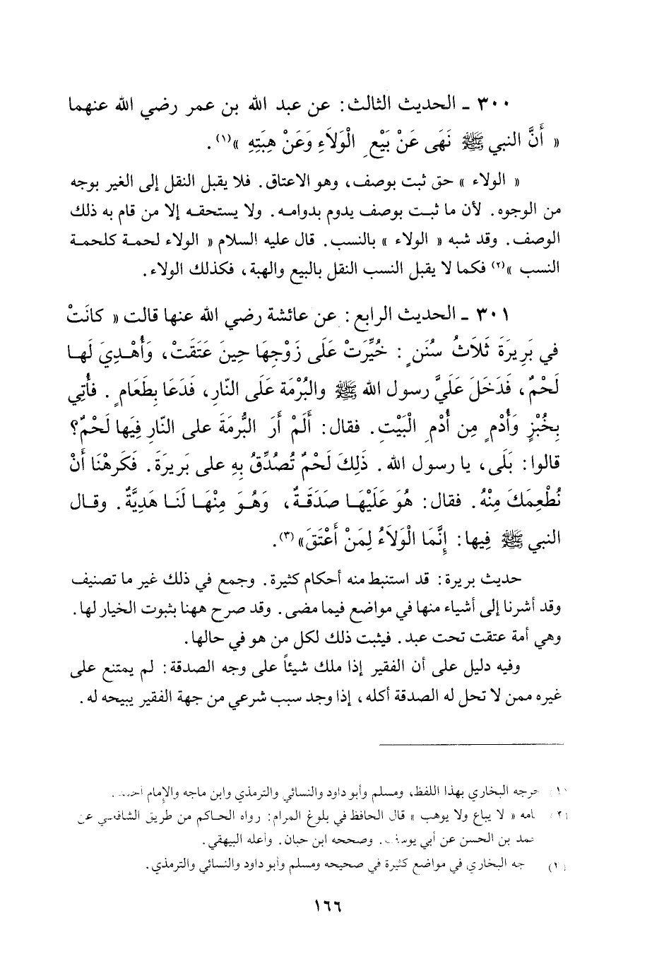 301 - الْحَدِيثُ الرَّابِعُ: عَنْ عَائِشَةَ - رَضِيَ اللَّهُ عَنْهَا - «قَالَتْ كَانَتْ فِي بَرِيرَةَ ثَلَاثُ سُنَنٍ: خُيِّرَتْ عَلَى زَوْجِهَا حِينَ عَتَقَتْ، وَأُهْدِيَ لَهَا لَحْمٌ، فَدَخَلَ عَلَيَّ رَسُولُ اللَّهِ - صَلَّى اللَّهُ عَلَيْهِ وَسَلَّمَ - وَالْبُرْمَةُ عَلَى النَّارِ، فَدَعَا بِطَعَامٍ فَأُتِيَ بِخُبْزٍ وَأُدْمٍ مِنْ أُدْمِ الْبَيْتِ فَقَالَ: أَلَمْ أَرَ الْبُرْمَةَ عَلَى النَّارِ فِيهَا لَحْمٌ؟ قَالُوا: بَلَى، يَا رَسُولَ اللَّهِ. ذَلِكَ لَحْمٌ تُصُدِّقَ بِهِ عَلَى بَرِيرَةَ فَكَرِهْنَا أَنْ نُطْعِمَكَ مِنْهُ فَقَالَ: هُوَ عَلَيْهَا صَدَقَةٌ، وَهُوَ مِنْهَا لَنَا هَدِيَّةٌ، وَقَالَ النَّبِيُّ - صَلَّى اللَّهُ عَلَيْهِ وَسَلَّمَ - فِيهَا: إنَّمَا الْوَلَاءُ لِمَنْ أَعْتَقَ»