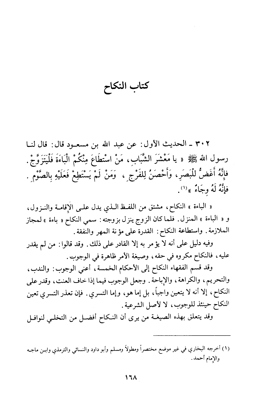 الْحَدِيثُ الْأَوَّلُ: عَنْ عَبْدِ اللَّهِ بْنِ مَسْعُودٍ قَالَ: قَالَ لَنَا رَسُولُ اللَّهِ - صَلَّى اللَّهُ عَلَيْهِ وَسَلَّمَ - «يَا مَعْشَرَ الشَّبَابِ، مَنْ اسْتَطَاعَ مِنْكُمْ الْبَاءَةَ فَلْيَتَزَوَّجْ فَإِنَّهُ أَغَضُّ لِلْبَصَرِ، وَأَحْصَنُ لِلْفَرْجِ، وَمَنْ لَمْ يَسْتَطِعْ فَعَلَيْهِ بِالصَّوْمِ فَإِنَّهُ لَهُ وِجَاءٌ»