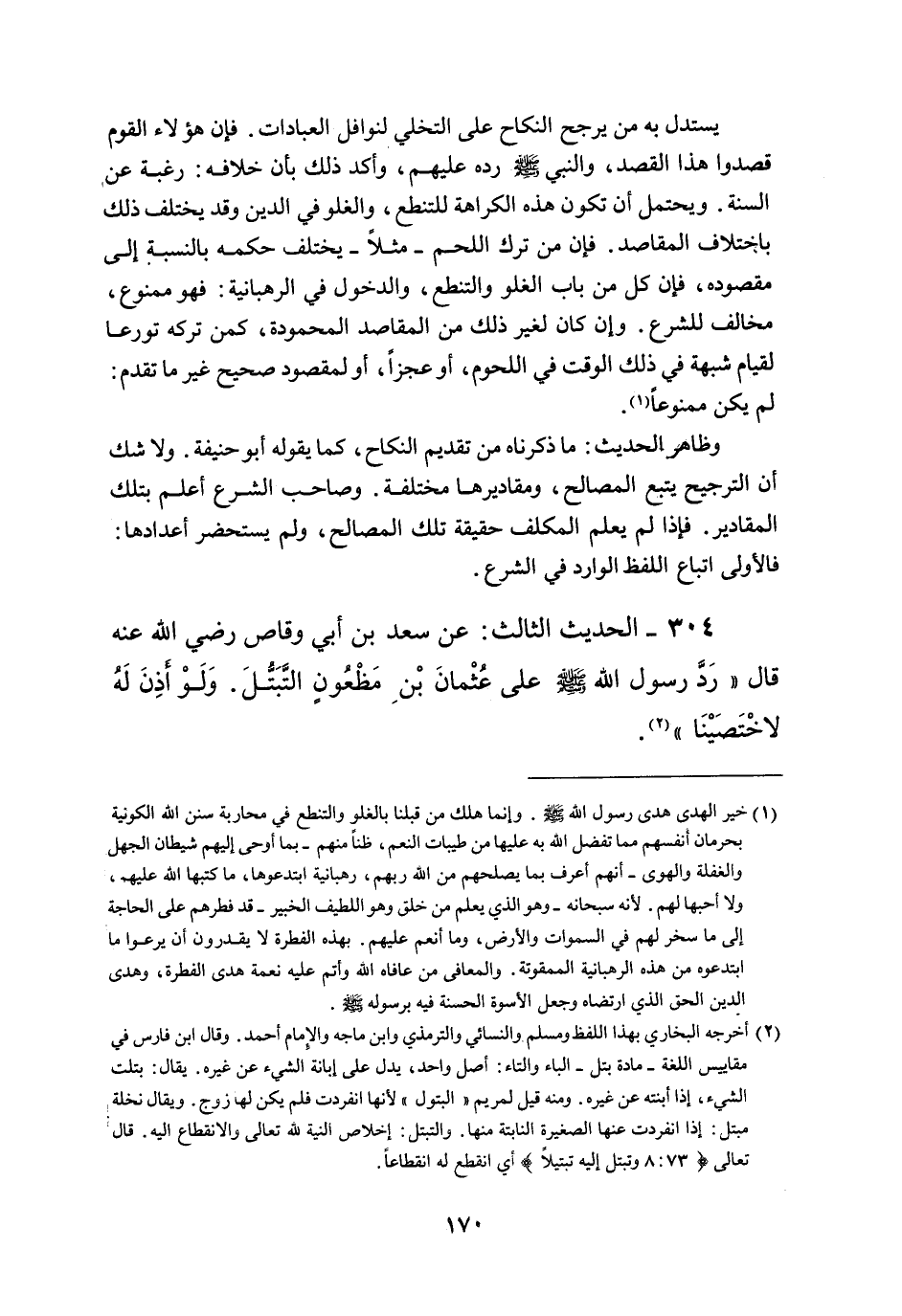 304 - الْحَدِيثُ الثَّالِثُ: عَنْ سَعْدِ بْنِ أَبِي وَقَّاصٍ - رَضِيَ اللَّهُ عَنْهُ - «قَالَ رَدَّ رَسُولُ اللَّهِ - صَلَّى اللَّهُ عَلَيْهِ وَسَلَّمَ - عَلَى عُثْمَانَ بْنِ مَظْعُونٍ التَّبَتُّلَ وَلَوْ أَذِنَ لَهُ لَاخْتَصَيْنَا»