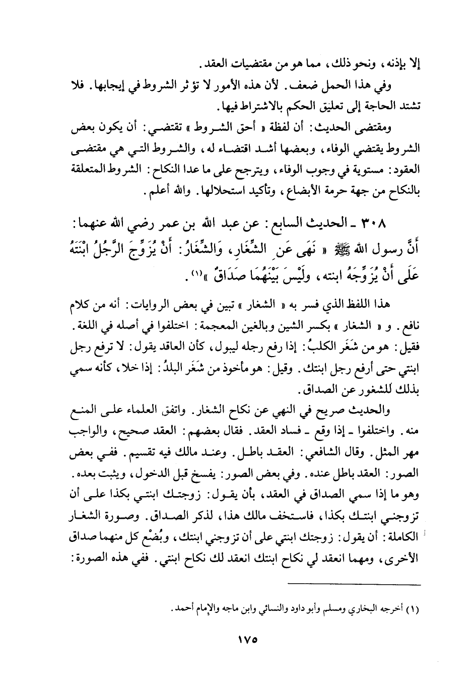 308 - الْحَدِيثُ السَّابِعُ: عَنْ عَبْدِ اللَّهِ بْنِ عُمَرَ - رَضِيَ اللَّهُ عَنْهُمَا -: «أَنَّ رَسُولَ اللَّهِ - صَلَّى اللَّهُ عَلَيْهِ وَسَلَّمَ - نَهَى عَنْ الشِّغَارِ، وَالشِّغَارُ: أَنْ يُزَوِّجَ الرَّجُلُ ابْنَتَهُ عَلَى أَنْ يُزَوِّجَهُ ابْنَتَهُ، وَلَيْسَ بَيْنَهُمَا الصَّدَاقُ»