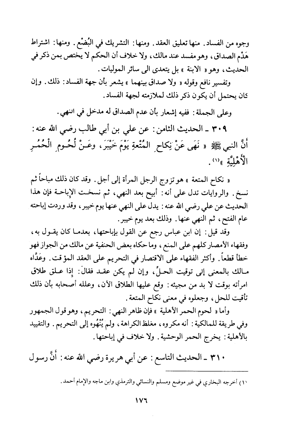 309 - الْحَدِيثُ الثَّامِنُ: عَنْ عَلِيِّ بْنِ أَبِي طَالِبٍ - رَضِيَ اللَّهُ عَنْهُ -: «أَنَّ النَّبِيَّ - صَلَّى اللَّهُ عَلَيْهِ وَسَلَّمَ - نَهَى عَنْ نِكَاحِ الْمُتْعَةِ يَوْمَ خَيْبَرَ، وَعَنْ لُحُومِ الْحُمُرِ الْأَهْلِيَّةِ»