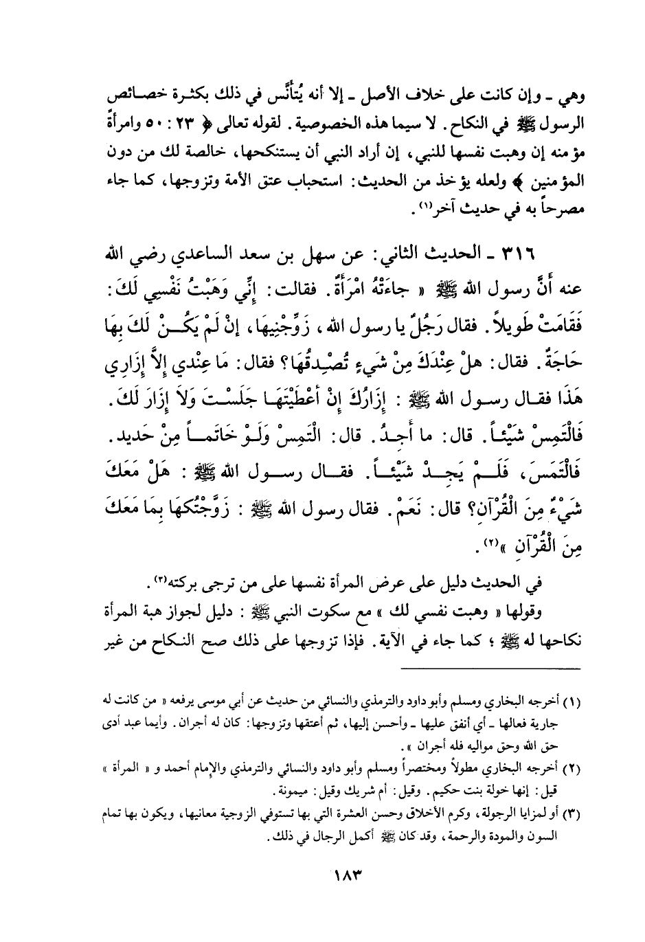 316 - الْحَدِيثُ الثَّانِي: عَنْ سَهْلِ بْنِ سَعْدٍ السَّاعِدِيِّ - رَضِيَ اللَّهُ عَنْهُ - «أَنَّ رَسُولَ اللَّهِ - صَلَّى اللَّهُ عَلَيْهِ وَسَلَّمَ - جَاءَتْهُ امْرَأَةٌ فَقَالَتْ: إنِّي وَهَبْتُ نَفْسِي لَكَ: فَقَامَتْ طَوِيلًا فَقَالَ رَجُلٌ يَا رَسُولَ اللَّهِ، زَوِّجْنِيهَا، إنْ لَمْ يَكُنْ لَكَ بِهَا حَاجَةٌ فَقَالَ هَلْ عِنْدَكَ مِنْ شَيْءٍ تُصْدِقُهَا؟ فَقَالَ: مَا عِنْدِي إلَّا إزَارِي هَذَا. فَقَالَ رَسُولُ اللَّهِ - صَلَّى اللَّهُ عَلَيْهِ وَسَلَّمَ - إزَارَكَ إنْ أَعْطَيْتَهَا جَلَسْتَ وَلَا إزَارَ لَكَ فَالْتَمِسْ شَيْئًا قَالَ: مَا أَجِدْ قَالَ: الْتَمِسْ وَلَوْ خَاتَمًا مِنْ حَدِيدٍ فَالْتَمَسَ، فَلَمْ يَجِدْ شَيْئًا فَقَالَ رَسُولُ اللَّهِ - صَلَّى اللَّهُ عَلَيْهِ وَسَلَّمَ - هَلْ مَعَكَ شَيْءٌ مِنْ الْقُرْآنِ؟ قَالَ: نَعَمْ فَقَالَ رَسُولُ اللَّهِ - صَلَّى اللَّهُ عَلَيْهِ وَسَلَّمَ -: زَوَّجْتُكَهَا بِمَا مَعَك مِنْ الْقُرْآنِ» .
