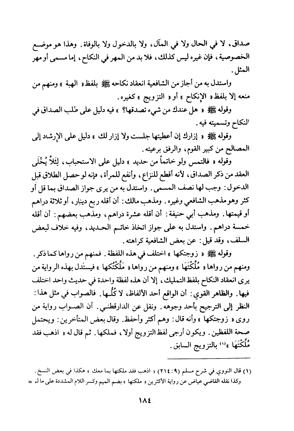 وَقَوْلُهُ - صَلَّى اللَّهُ عَلَيْهِ وَسَلَّمَ - " زَوَّجْتُكَهَا " اُخْتُلِفَ فِي هَذِهِ اللَّفْظَةِ فَمِنْهُمْ مَنْ رَوَاهَا كَمَا ذُكِرَ وَمِنْهُمْ مَنْ رَوَاهَا " مُلِّكْتَهَا " وَمِنْهُمْ مَنْ رَوَاهَا " مَلَّكْتُكَهَا " فَيَسْتَدِلُّ بِهَذِهِ الرِّوَايَةِ مَنْ يَرَى انْعِقَادَ النِّكَاحِ بِلَفْظِ التَّمْلِيكِ، إلَّا أَنَّ هَذِهِ لَفْظَةٌ وَاحِدَةٌ فِي حَدِيثٍ وَاحِدٍ اُخْتُلِفَ فِيهَا. وَالظَّاهِرُ الْقَوِيُّ: أَنَّ الْوَاقِعَ أَحَدُ الْأَلْفَاظِ، لَا كُلُّهَا. فَالصَّوَابُ فِي مِثْلِ هَذَا النَّظَرُ إلَى التَّرْجِيحِ بِأَحَدِ وُجُوهِهِ وَنُقِلَ عَنْ الدَّارَقُطْنِيِّ أَنَّ الصَّوَابَ رِوَايَةُ مَنْ رَوَى " زَوَّجْتُكَهَا "، وَأَنَّهُ قَالَ: وَهُمْ أَكْثَرُ وَأَحْفَظُ، وَقَالَ بَعْضُ الْمُتَأَخِّرِينَ: وَيُحْتَمَلُ صِحَّةُ اللَّفْظَيْنِ وَيَكُونُ أَرْجَى لَفْظَ التَّزْوِيجِ أَوَّلًا، فَمَلَّكَهَا. ثُمَّ قَالَ لَهُ " اذْهَبْ فَقَدْ مُلِّكْتَهَا " بِالتَّزْوِيجِ السَّابِقِ