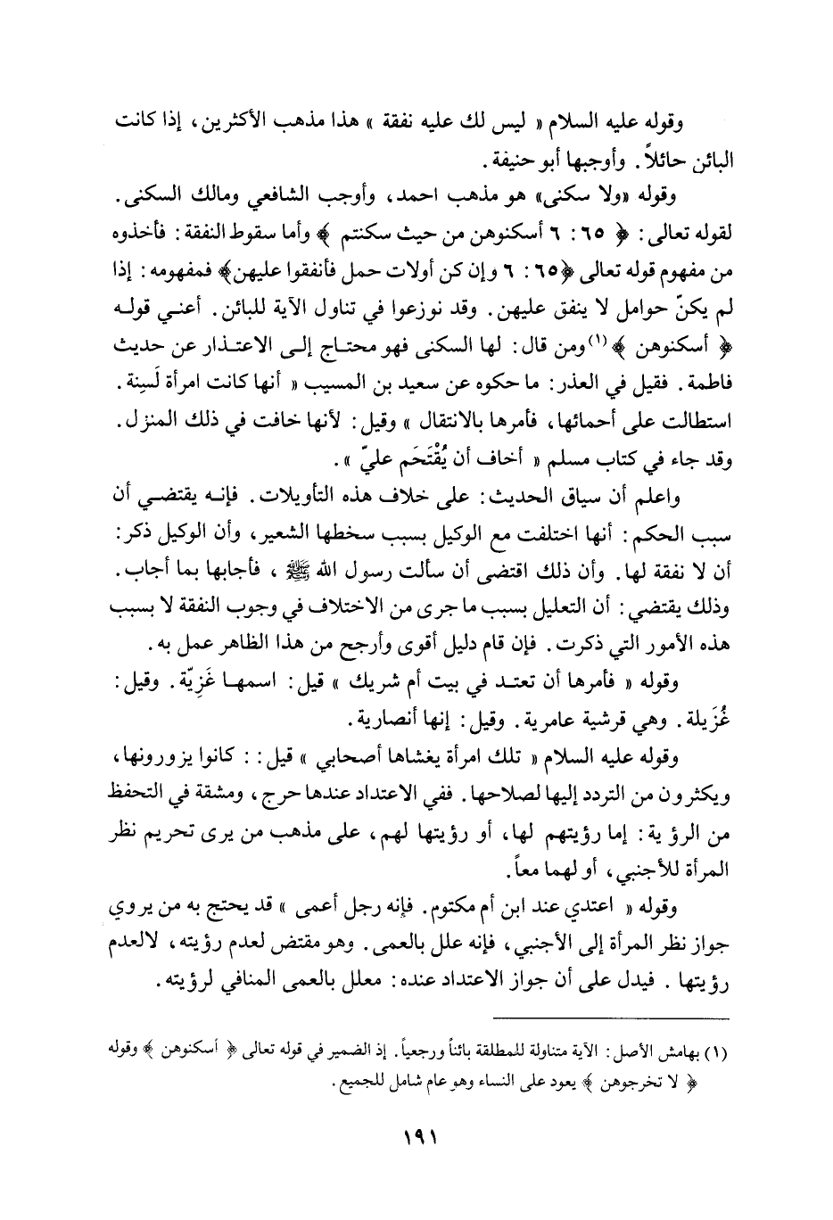 ـــــــــــــــــــــــــــــQوَقَوْلُهُ - عَلَيْهِ السَّلَامُ - " لَيْسَ لَكِ عَلَيْهِ نَفَقَةٌ " هَذَا مَذْهَبُ الْأَكْثَرِينَ، إذَا كَانَتْ الْبَائِنُ حَائِلًا وَأَوْجَبَهَا أَبُو حَنِيفَةَ.