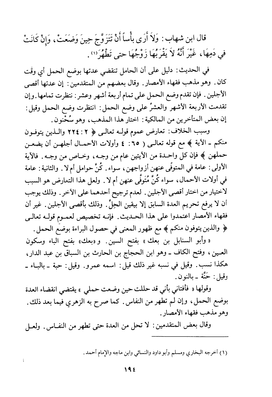 وَالثَّانِيَةُ: عَامَّةٌ فِي أُولَاتِ الْأَحْمَالِ، سَوَاءٌ كُنَّ مُتَوَفَّى عَنْهُنَّ أَمْ لَا. وَلَعَلَّ هَذَا التَّعَارُضَ هُوَ السَّبَبُ لِاخْتِيَارِ مَنْ اخْتَارَ أَقْصَى الْأَجَلَيْنِ لِعَدَمِ تَرْجِيحِ أَحَدِهِمَا عَلَى الْآخَرِ وَذَلِكَ يُوجِبُ أَنْ لَا يُرْفَعَ تَحْرِيمُ الْعِدَّةِ السَّابِقُ إلَّا بِيَقِينِ الْحِلِّ وَذَلِكَ بِأَقْصَى الْأَجَلَيْنِ. غَيْرَ أَنَّ فُقَهَاءَ الْأَمْصَارِ اعْتَمَدُوا عَلَى هَذَا الْحَدِيثِ فِي أَنَّهُ تَخْصِيصٌ لِعُمُومِ قَوْله تَعَالَى {وَالَّذِينَ يُتَوَفَّوْنَ مِنْكُمْ} [البقرة: 234] مَعَ ظُهُورِ الْمَعْنَى فِي حُصُولِ الْبَرَاءَةِ بِوَضْعِ الْحَمْلِ ".