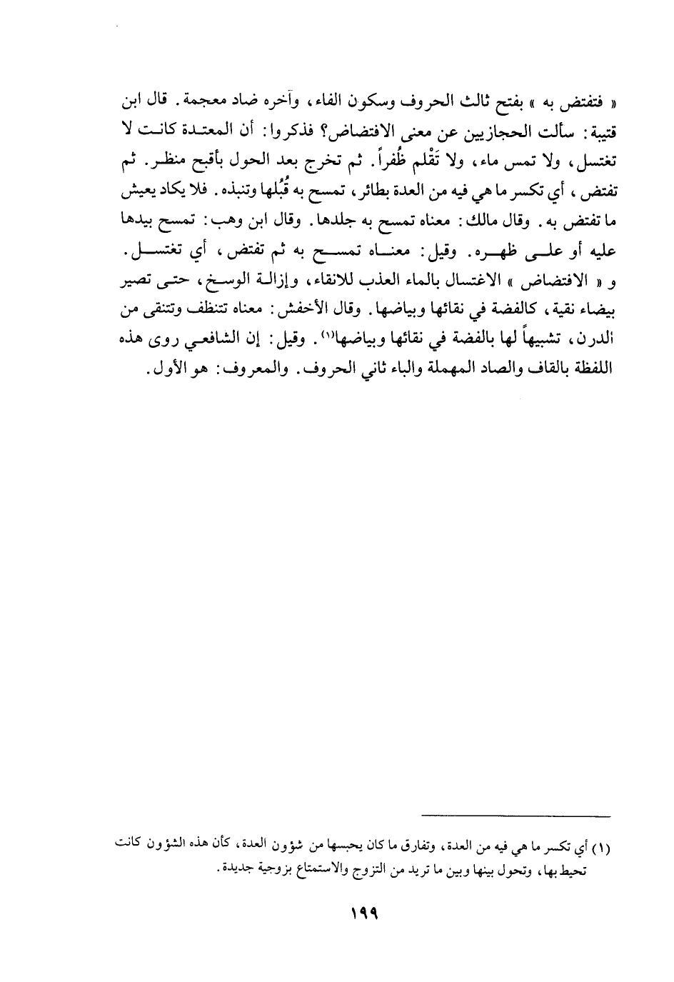 ـــــــــــــــــــــــــــــQفَتَفْتَضَّ بِهِ " بِفَتْحِ ثَالِثِ الْحُرُوفِ وَسُكُونِ الْفَاءِ، وَآخِرُهُ ضَادٌ مُعْجَمَةٌ. قَالَ ابْنُ قُتَيْبَةَ: سَأَلْتُ الْحِجَازِيِّينَ عَنْ مَعْنَى الِافْتِضَاضِ؟ فَذَكَرُوا: أَنَّ الْمُعْتَدَّةَ كَانَتْ لَا تَغْتَسِلُ، وَلَا تَمَسُّ مَاءً، وَلَا تُقَلِّمُ ظُفْرًا. ثُمَّ تَخْرُجُ بَعْدَ الْحَوْلِ بِأَقْبَحِ مَنْظَرٍ ثُمَّ تَفْتَضُّ، أَيْ تَكْسِرُ مَا هِيَ فِيهِ مِنْ الْعِدَّةِ بِطَائِرٍ، تَمْسَحُ بِهِ قُبُلَهَا وَتَنْبِذُهُ فَلَا يَكَادُ يَعِيشُ مَا تَفْتَضُّ بِهِ. وَقَالَ مَالِكٌ: مَعْنَاهُ تَمْسَحُ بِهِ جِلْدَهَا وَقَالَ ابْنُ وَهْبٍ: تَمْسَحُ بِيَدِهَا عَلَيْهِ أَوْ عَلَى ظَهْرِهِ وَقِيلَ: مَعْنَاهُ تَمْسَحُ بِهِ ثُمَّ تَفْتَضُّ، أَيْ تَغْتَسِلُ وَ " الِافْتِضَاضُ " الِاغْتِسَالُ بِالْمَاءِ الْعَذْبِ لِلْإِنْقَاءِ، وَإِزَالَةِ الْوَسَخِ، حَتَّى تَصِيرَ بَيْضَاءَ نَقِيَّةً، كَالْفِضَّةِ فِي نَقَائِهَا وَبَيَاضِهَا. وَقَالَ الْأَخْفَشُ: مَعْنَاهُ تَتَنَظَّفُ وَتَتَنَقَّى مِنْ الدَّرَنِ، تَشْبِيهًا لَهَا بِالْفِضَّةِ فِي نَقَائِهَا وَبَيَاضِهَا. وَقِيلَ: إنَّ الشَّافِعِيَّ رَوَى هَذِهِ اللَّفْظَةَ بِالْقَافِ وَالصَّادِ الْمُهْمَلَةِ وَالْبَاءِ ثَانِي الْحُرُوفِ وَالْمَعْرُوفُ: هُوَ الْأَوَّلُ.