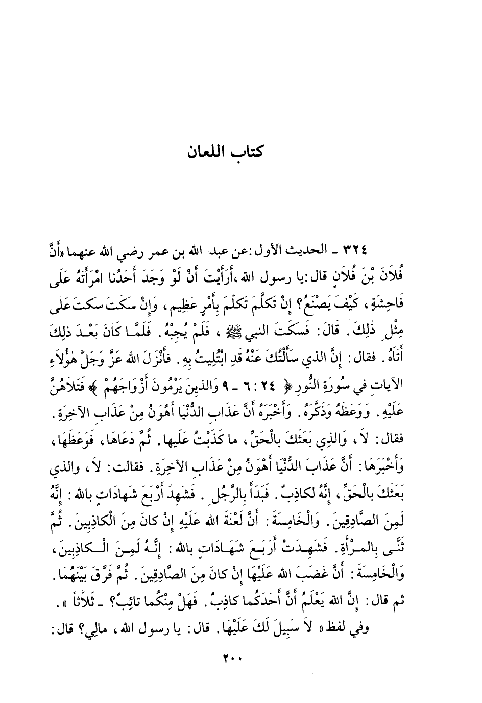 الْحَدِيثُ الْأَوَّلُ: عَنْ عَبْدِ اللَّهِ بْنِ عُمَرَ - رَضِيَ اللَّهُ عَنْهُمَا - " أَنَّ فُلَانَ بْنَ فُلَانٍ قَالَ: «يَا رَسُولَ اللَّهِ، أَرَأَيْتَ أَنْ لَوْ وَجَدَ أَحَدُنَا امْرَأَتَهُ عَلَى فَاحِشَةٍ، كَيْفَ يَصْنَعُ؟ إنْ تَكَلَّمَ تَكَلَّمَ بِأَمْرٍ عَظِيمٍ، وَإِنْ سَكَتَ سَكَتَ عَلَى مِثْلِ ذَلِكَ. قَالَ: فَسَكَتَ النَّبِيُّ - صَلَّى اللَّهُ عَلَيْهِ وَسَلَّمَ - فَلَمْ يُجِبْهُ. فَلَمَّا كَانَ بَعْدَ ذَلِكَ أَتَاهُ فَقَالَ: إنَّ الَّذِي سَأَلْتُكَ عَنْهُ قَدْ اُبْتُلِيتُ بِهِ. فَأَنْزَلَ اللَّهُ عَزَّ وَجَلَّ هَؤُلَاءِ الْآيَاتِ فِي سُورَةِ النُّورِ {وَالَّذِينَ يَرْمُونَ أَزْوَاجَهُمْ} [النور: 6] فَتَلَاهُنَّ عَلَيْهِ وَوَعَظَهُ وَذَكَّرَهُ. وَأَخْبَرَهُ أَنَّ عَذَابَ الدُّنْيَا أَهْوَنُ مِنْ عَذَابِ الْآخِرَةِ. فَقَالَ: لَا، وَاَلَّذِي بَعَثَكَ بِالْحَقِّ، مَا كَذَبْتُ عَلَيْهَا. ثُمَّ دَعَاهَا، فَوَعَظَهَا، وَأَخْبَرَهَا: أَنَّ عَذَابَ الدُّنْيَا أَهْوَنُ مِنْ عَذَابِ الْآخِرَةِ. فَقَالَتْ: لَا، وَاَلَّذِي بَعَثَكَ بِالْحَقِّ، إنَّهُ لَكَاذِبٌ. فَبَدَأَ بِالرَّجُلِ فَشَهِدَ أَرْبَعَ شَهَادَاتٍ بِاَللَّهِ: إنَّهُ لَمِنْ الصَّادِقِينَ. وَالْخَامِسَةَ: أَنَّ لَعْنَةَ اللَّهِ عَلَيْهِ إنْ كَانَ مِنْ الْكَاذِبِينَ. ثُمَّ ثَنَّى بِالْمَرْأَةِ. فَشَهِدَتْ أَرْبَعَ شَهَادَاتٍ بِاَللَّهِ: إنَّهُ لَمِنْ الْكَاذِبِينَ، وَالْخَامِسَةَ: أَنَّ غَضَبَ اللَّهِ عَلَيْهَا إنْ كَانَ مِنْ الصَّادِقِينَ. ثُمَّ فَرَّقَ بَيْنَهُمَا. ثُمَّ قَالَ: إنَّ اللَّهَ يَعْلَمُ أَنَّ أَحَدَكُمَا كَاذِبٌ فَهَلْ مِنْكُمَا تَائِبٌ؟ - ثَلَاثًا» .
