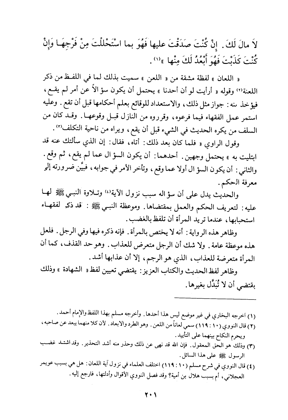 " اللِّعَانُ " لَفْظَةٌ مُشْتَقَّةٌ مِنْ " اللَّعْنِ " سُمِّيَتْ بِذَلِكَ لِمَا فِي اللَّفْظِ مِنْ ذِكْرِ اللَّعْنَةِ. وَقَوْلُهُ " أَرَأَيْتَ لَوْ أَنَّ أَحَدَنَا " يَحْتَمِلُ أَنْ يَكُونَ سُؤَالًا عَنْ أَمْرٍ لَمْ يَقَعْ، فَيُؤْخَذُ مِنْهُ: جَوَازُ مِثْلِ ذَلِكَ، وَالِاسْتِعْدَادُ لِلْوَقَائِعِ بِعِلْمِ أَحْكَامِهَا قَبْلَ أَنْ تَقَعَ وَعَلَيْهِ اسْتَمَرَّ عَمَلُ الْفُقَهَاءِ فِيمَا فَرَّعُوهُ، وَقَرَّرُوهُ مِنْ النَّازِلِ قَبْلَ وُقُوعِهَا. وَقَدْ كَانَ مِنْ السَّلَفِ مَنْ يَكْرَهُ الْحَدِيثَ فِي الشَّيْءِ قَبْلَ أَنْ يَقَعَ، وَيَرَاهُ مِنْ نَاحِيَةِ التَّكَلُّفِ.