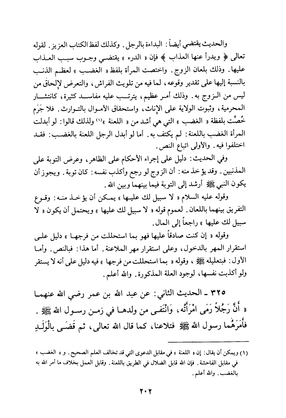 325 - الْحَدِيثُ الثَّانِي: عَنْ عَبْدِ اللَّهِ بْنِ عُمَرَ - رَضِيَ اللَّهُ عَنْهُمَا - «أَنَّ رَجُلًا رَمَى امْرَأَتَهُ، وَانْتَفَى مِنْ وَلَدِهَا فِي زَمَنِ رَسُولِ اللَّهِ - صَلَّى اللَّهُ عَلَيْهِ وَسَلَّمَ - فَأَمَرَهُمَا رَسُولُ اللَّهِ - صَلَّى اللَّهُ عَلَيْهِ وَسَلَّمَ - فَتَلَاعَنَا، كَمَا قَالَ اللَّه تَعَالَى، ثُمَّ قَضَى بِالْوَلَدِ