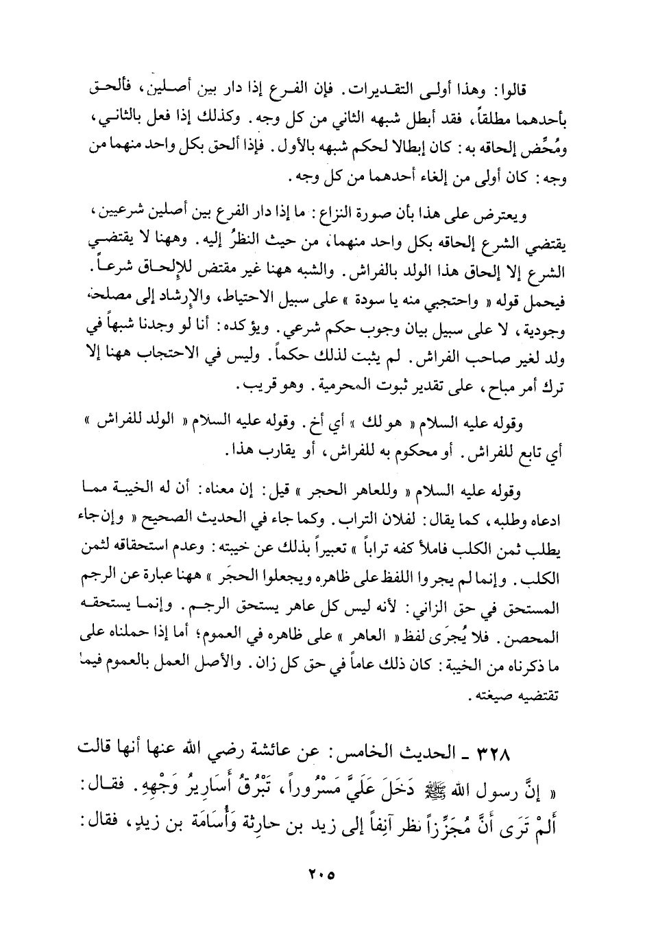 328 - الْحَدِيثُ الْخَامِسُ: عَنْ عَائِشَةَ - رَضِيَ اللَّهُ عَنْهَا - أَنَّهَا قَالَتْ «إنَّ رَسُولَ اللَّهِ - صَلَّى اللَّهُ عَلَيْهِ وَسَلَّمَ - دَخَلَ عَلَيَّ مَسْرُورًا، تَبْرُقُ أَسَارِيرُ وَجْهِهِ. فَقَالَ: أَلَمْ تَرَيْ أَنَّ مُجَزِّزًا نَظَرَ آنِفًا إلَى زَيْدِ بْنِ حَارِثَةَ وَأُسَامَةَ بْنِ زَيْدٍ، فَقَالَ: