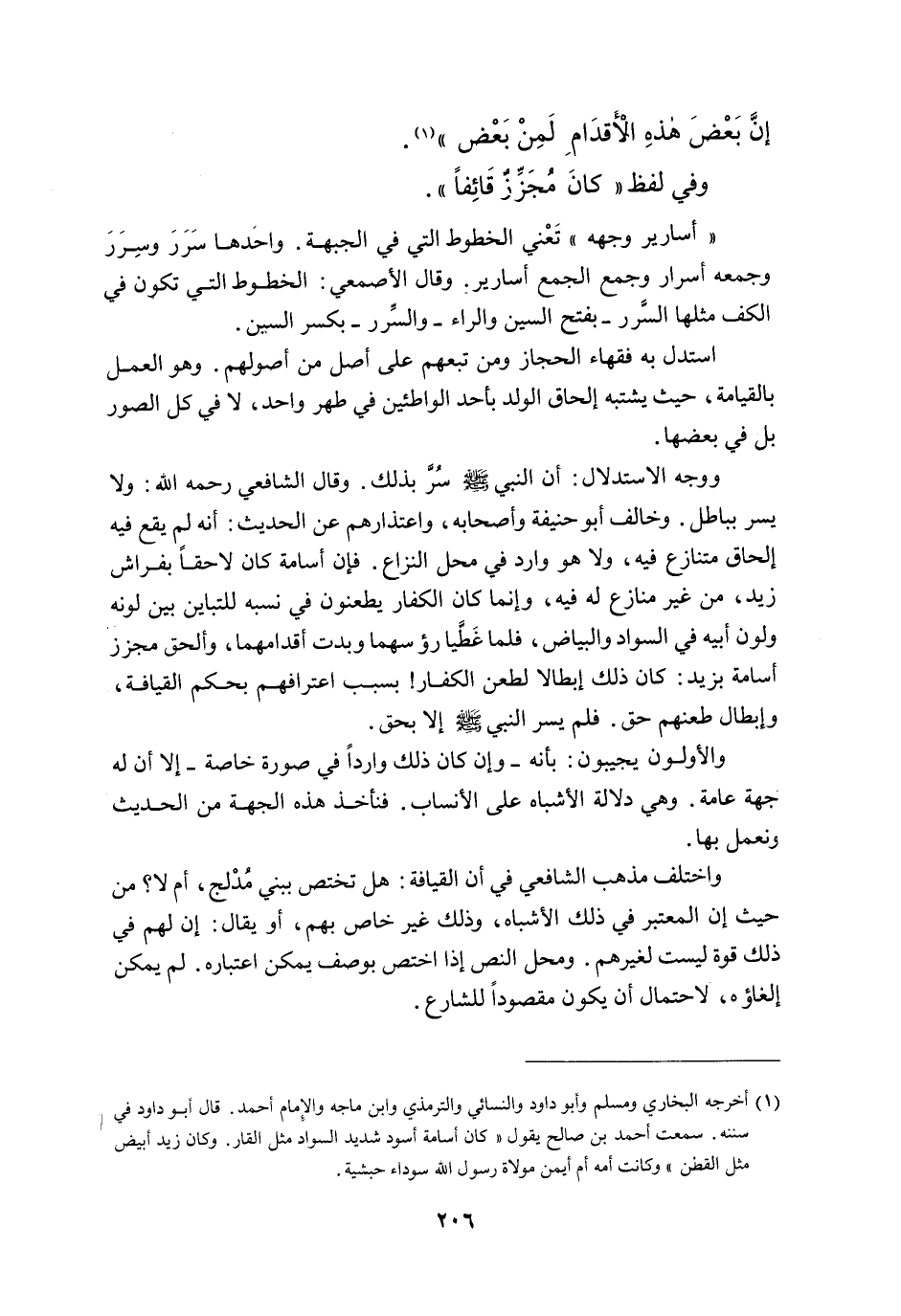 وَوَجْهُ الِاسْتِدْلَالِ: أَنَّ النَّبِيَّ - صَلَّى اللَّهُ عَلَيْهِ وَسَلَّمَ - سُرَّ بِذَلِكَ وَقَالَ الشَّافِعِيُّ - رَحِمَهُ اللَّهُ -: وَلَا يُسَرُّ بِبَاطِلٍ. وَخَالَفَ أَبُو حَنِيفَةَ وَأَصْحَابُهُ، وَاعْتِذَارُهُمْ عَنْ الْحَدِيثِ: أَنَّهُ لَمْ يَقَعْ فِيهِ إلْحَاقُ مُتَنَازَعٍ فِيهِ، وَلَا هُوَ وَارِدٌ فِي مَحِلِّ النِّزَاعِ. فَإِنَّ أُسَامَةَ كَانَ لَاحِقًا بِفِرَاشِ زَيْدٍ، مِنْ غَيْرِ مُنَازِعٍ لَهُ فِيهِ، وَإِنَّمَا كَانَ الْكُفَّارُ يَطْعَنُونَ فِي نَسَبِهِ لِلتَّبَايُنِ بَيْنَ لَوْنِهِ وَلَوْنِ أَبِيهِ فِي السَّوَادِ وَالْبَيَاضِ، فَلَمَّا غَطَّيَا رُءُوسَهُمَا وَبَدَتْ أَقْدَامُهُمَا، وَأَلْحَقَ مُجَزِّزٌ أُسَامَةَ بِزَيْدٍ: كَانَ ذَلِكَ إبْطَالًا لِطَعْنِ الْكُفَّارِ بِسَبَبِ اعْتِرَافِهِمْ بِحُكْمِ الْقِيَافَةِ " وَإِبْطَالُ طَعْنِهِمْ حَقٌّ. فَلَمْ يُسَرَّ النَّبِيُّ - صَلَّى اللَّهُ عَلَيْهِ وَسَلَّمَ - إلَّا بِحَقٍّ.
