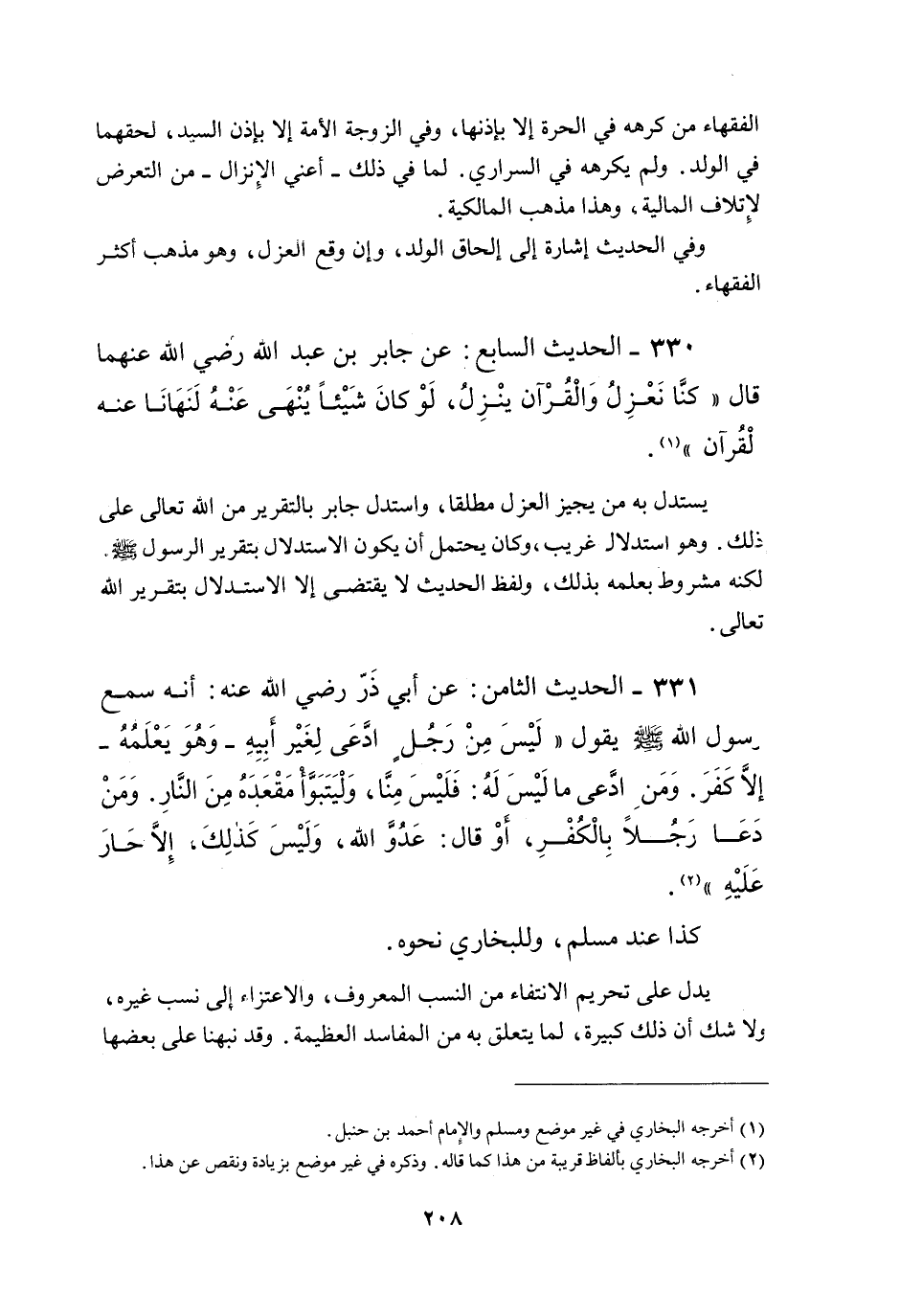 330 - الْحَدِيثُ السَّابِعُ: عَنْ جَابِرِ بْنِ عَبْدِ اللَّهِ - رَضِيَ اللَّهُ عَنْهُمَا - قَالَ «كُنَّا نَعْزِلُ وَالْقُرْآنُ يَنْزِلُ، لَوْ كَانَ شَيْئًا يُنْهَى عَنْهُ لَنَهَانَا عَنْهُ الْقُرْآنُ» .
