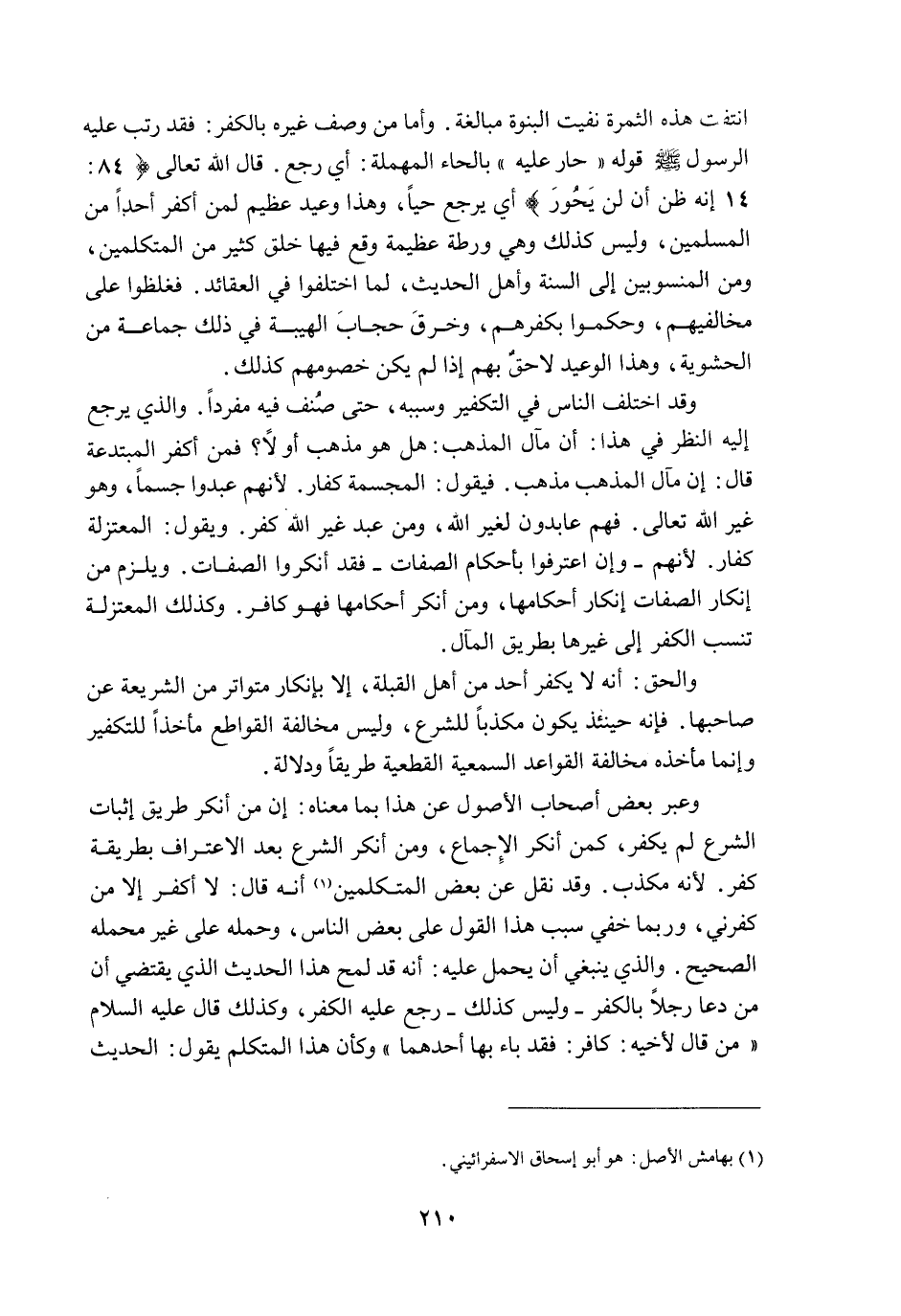 وَعَبَّرَ بَعْضُ أَصْحَابِ الْأُصُولِ عَنْ هَذَا بِمَا مَعْنَاهُ: إنَّ مَنْ أَنْكَرَ طَرِيقَ إثْبَاتِ الشَّرْعِ لَمْ يَكْفُرْ، كَمَنْ أَنْكَرَ الْإِجْمَاعَ، وَمَنْ أَنْكَرَ الشَّرْعَ بَعْدَ الِاعْتِرَافِ بِطَرِيقِهِ كَفَرَ؛ لِأَنَّهُ مُكَذِّبٌ. وَقَدْ نُقِلَ عَنْ بَعْضِ الْمُتَكَلِّمِينَ أَنَّهُ قَالَ: لَا أُكَفِّرُ إلَّا مَنْ كَفَّرَنِي، وَرُبَّمَا خَفِيَ سَبَبُ هَذَا الْقَوْلِ عَلَى بَعْضِ النَّاسِ، وَحَمَلَهُ عَلَى غَيْرِ مَحْمَلِهِ الصَّحِيحِ، وَاَلَّذِي يَنْبَغِي أَنْ يُحْمَلَ عَلَيْهِ: أَنَّهُ قَدْ لَمَحَ هَذَا الْحَدِيثَ الَّذِي يَقْتَضِي أَنَّ مَنْ دَعَا رَجُلًا بِالْكُفْرِ - وَلَيْسَ كَذَلِكَ - رَجَعَ عَلَيْهِ الْكُفْرُ، وَكَذَلِكَ قَالَ - عَلَيْهِ السَّلَامُ - «مَنْ قَالَ لِأَخِيهِ: كَافِرٌ: فَقَدْ بَاءَ بِهَا أَحَدُهُمَا» وَكَأَنَّ هَذَا الْمُتَكَلِّمَ يَقُولُ: الْحَدِيثُ