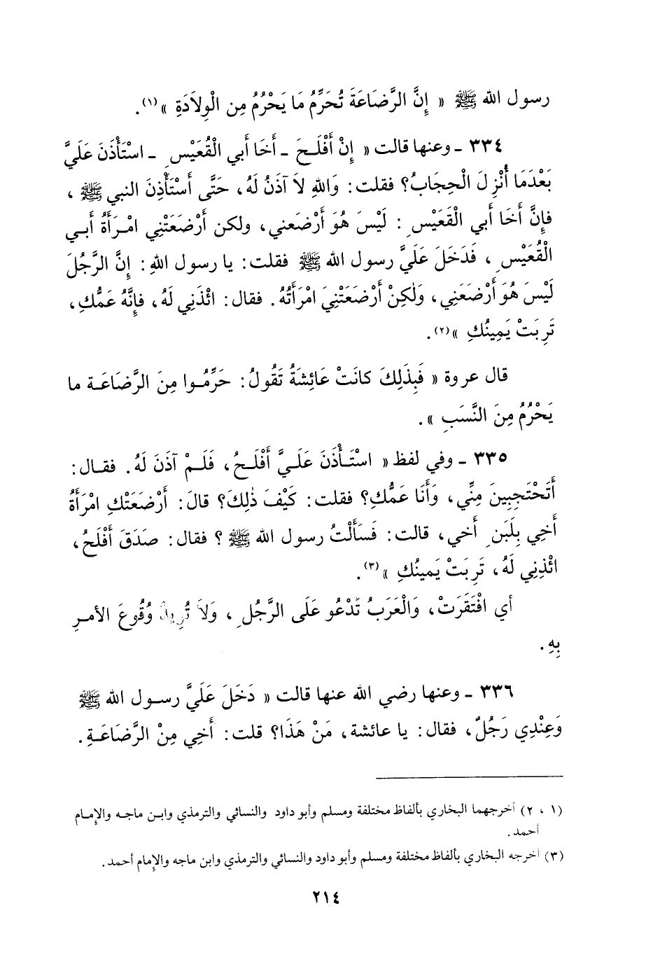 رَسُولُ اللَّهِ - صَلَّى اللَّهُ عَلَيْهِ وَسَلَّمَ - «إنَّ الرَّضَاعَةَ تُحَرِّمُ مَا يَحْرُمُ مِنْ الْوِلَادَةِ» 334 - وَعَنْهَا قَالَتْ «إنَّ أَفْلَحَ - أَخَا أَبِي الْقُعَيْسِ - اسْتَأْذَنَ عَلَيَّ بَعْدَمَا أُنْزِلَ الْحِجَابُ؟ فَقُلْت: وَاَللَّهِ لَا آذَنُ لَهُ، حَتَّى أَسْتَأْذِنَ النَّبِيَّ - صَلَّى اللَّهُ عَلَيْهِ وَسَلَّمَ - فَإِنَّ أَخَا أَبِي الْقُعَيْسِ: لَيْسَ هُوَ أَرْضَعَنِي، وَلَكِنْ أَرْضَعَتْنِي امْرَأَةُ أَبِي الْقُعَيْسِ، فَدَخَلَ عَلَيَّ رَسُولُ اللَّهِ - صَلَّى اللَّهُ عَلَيْهِ وَسَلَّمَ - فَقُلْت: يَا رَسُولَ اللَّهِ: إنَّ الرَّجُلَ لَيْسَ هُوَ أَرْضَعَنِي، وَلَكِنْ أَرْضَعَتْنِي امْرَأَتُهُ. فَقَالَ: ائْذَنِي لَهُ، فَإِنَّهُ عَمُّك، تَرِبَتْ يَمِينُك» . قَالَ عُرْوَةُ " فَبِذَلِكَ كَانَتْ عَائِشَةُ تَقُولُ: حَرِّمُوا مِنْ الرَّضَاعَةِ مَا يَحْرُمُ مِنْ النَّسَبِ " 335 - وَفِي لَفْظٍ «اسْتَأْذَنَ عَلَيَّ أَفْلَحُ، فَلَمْ آذَنْ لَهُ. فَقَالَ: أَتَحْتَجِبِينَ مِنِّي، وَأَنَا عَمُّك؟ فَقُلْت: كَيْفَ ذَلِكَ؟ قَالَ: أَرْضَعَتْك امْرَأَةُ أَخِي بِلَبَنِ أَخِي، قَالَتْ: فَسَأَلْت رَسُولَ اللَّهِ - صَلَّى اللَّهُ عَلَيْهِ وَسَلَّمَ - فَقَالَ: صَدَقَ أَفْلَحُ، ائْذَنِي لَهُ، تَرِبَتْ يَمِينُك» أَيْ افْتَقَرَتْ، وَالْعَرَبُ تَدْعُوَا عَلَى الرَّجُلِ، وَلَا تُرِيدُ وُقُوعَ الْأَمْرِ بِهِ.