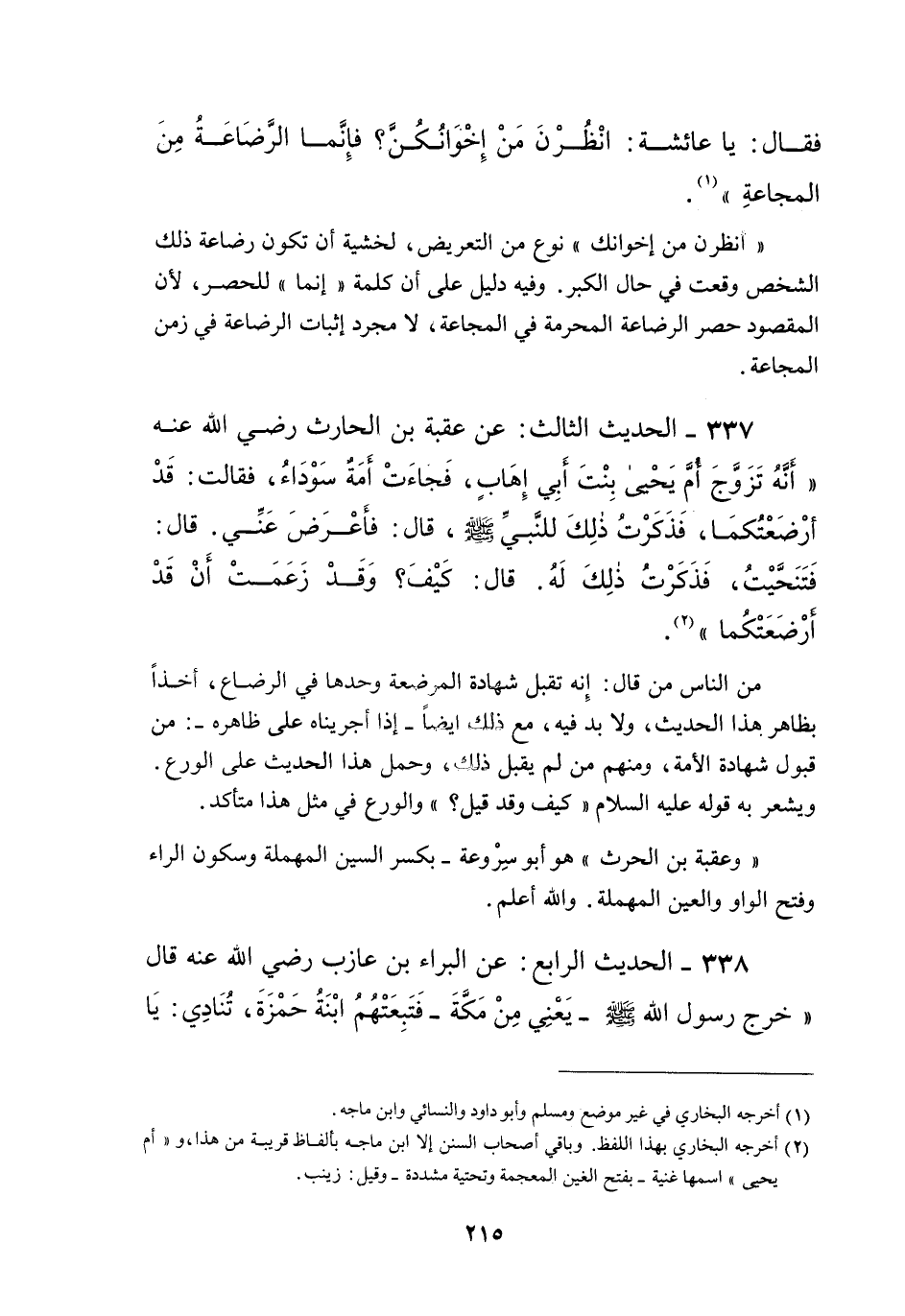 337 - الْحَدِيثُ الثَّالِثُ: «عَنْ عُقْبَةَ بْنِ الْحَارِثِ - رَضِيَ اللَّهُ عَنْهُ - أَنَّهُ تَزَوَّجَ أُمَّ يَحْيَى بِنْتَ أَبِي إهَابٍ، فَجَاءَتْ أَمَةٌ سَوْدَاءُ، فَقَالَتْ: قَدْ أَرْضَعْتُكُمَا، فَذَكَرْتُ ذَلِكَ لِلنَّبِيِّ - صَلَّى اللَّهُ عَلَيْهِ وَسَلَّمَ - قَالَ: فَأَعْرَضَ عَنِّي. قَالَ: فَتَنَحَّيْت، فَذَكَرْت ذَلِكَ لَهُ. قَالَ: كَيْفَ؟ وَقَدْ زَعَمَتْ أَنْ قَدْ أَرْضَعَتْكُمَا» .