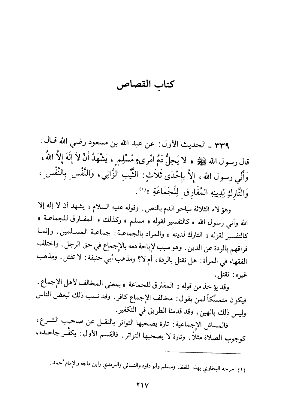الْحَدِيثُ الْأَوَّلُ عَنْ عَبْدِ اللَّهِ بْنِ مَسْعُودٍ - رَضِيَ اللَّهُ عَنْهُ - قَالَ: قَالَ رَسُولُ اللَّهِ - صَلَّى اللَّهُ عَلَيْهِ وَسَلَّمَ - «لَا يَحِلُّ دَمُ امْرِئٍ مُسْلِمٍ يَشْهَدُ أَنْ لَا إلَهَ إلَّا اللَّهُ وَأَنِّي رَسُولُ اللَّه إلَّا بِإِحْدَى ثَلَاثٍ الثَّيِّبُ الزَّانِي، وَالنَّفْسُ بِالنَّفْسِ، وَالتَّارِكُ لِدِينِهِ الْمُفَارِقُ لِلْجَمَاعَةِ»