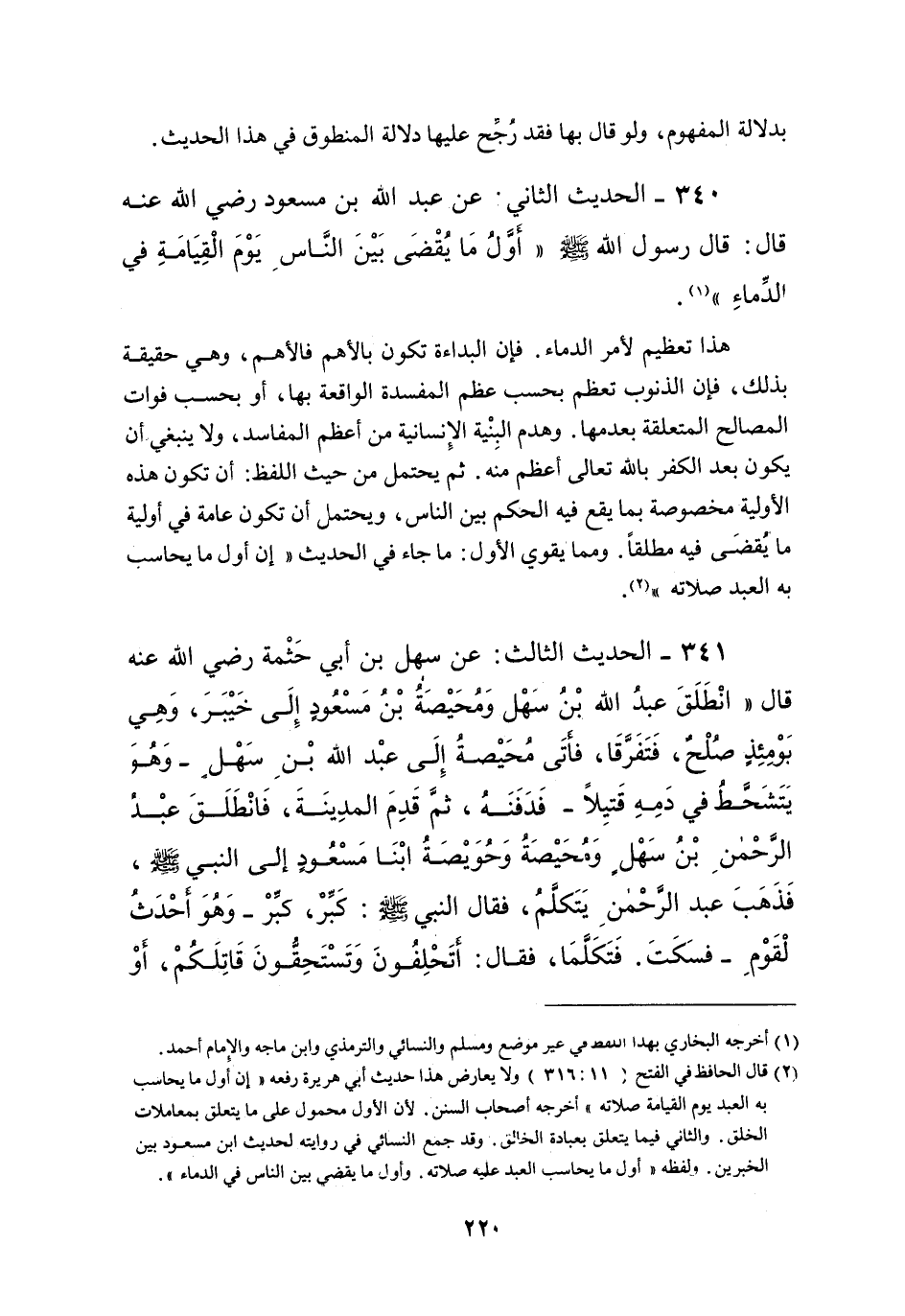 341 - الْحَدِيثُ الثَّالِثُ: عَنْ سَهْلِ بْنِ أَبِي حَثْمَةَ - رَضِيَ اللَّهُ عَنْهُ - قَالَ «انْطَلَقَ عَبْدُ اللَّهِ بْنُ سَهْلٍ وَمُحَيِّصَةُ بْنُ مَسْعُودٍ إلَى خَيْبَرَ، وَهِيَ يَوْمَئِذٍ صُلْحٌ، فَتَفَرَّقَا، فَأَتَى مُحَيِّصَةُ إلَى عَبْدِ اللَّهِ بْنِ سَهْلٍ - وَهُوَ يَتَشَحَّطُ فِي دَمِهِ قَتِيلًا - فَدَفْنه، ثُمَّ قَدِمَ الْمَدِينَةَ، فَانْطَلَقَ عَبْدُ الرَّحْمَنِ بْنُ سَهْلٍ وَمُحَيِّصَةُ وَحُوَيِّصَةُ ابْنَا مَسْعُودٍ إلَى النَّبِيِّ - صَلَّى اللَّهُ عَلَيْهِ وَسَلَّمَ - فَذَهَبَ عَبْدُ الرَّحْمَنِ يَتَكَلَّمُ، فَقَالَ النَّبِيُّ - صَلَّى اللَّهُ عَلَيْهِ وَسَلَّمَ -: كَبِّرْ، كَبِّرْ - وَهُوَ أَحْدَثُ الْقَوْمِ - فَسَكَتَ فَتَكَلَّمَا، فَقَالَ: أَتَحْلِفُونَ وَتَسْتَحِقُّونَ قَاتِلَكُمْ، أَوْ