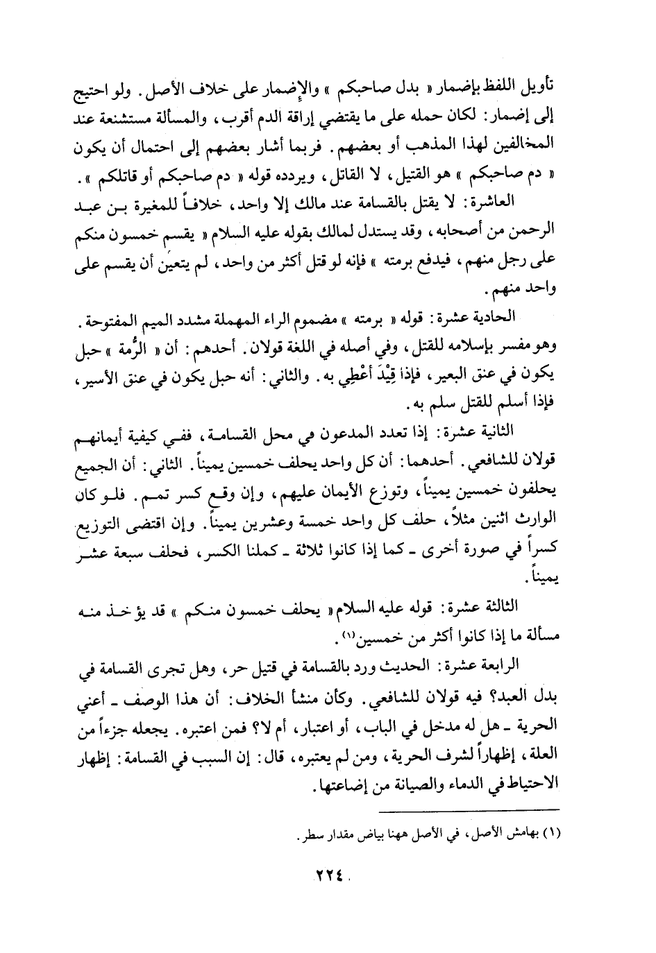 الرَّابِعَةَ عَشْرَةَ: الْحَدِيثُ وَرَدَ بِالْقَسَامَةِ فِي قَتِيلٍ حُرٍّ، وَهَلْ تَجْرِي الْقَسَامَةُ فِي بَدَلِ الْعَبْدِ؟ فِيهِ قَوْلَانِ لِلشَّافِعِيِّ وَكَأَنَّ مَنْشَأَ الْخِلَافِ: أَنَّ هَذَا الْوَصْفَ - أَعْنِي الْحُرِّيَّةَ - هَلْ لَهُ مَدْخَلٌ فِي الْبَابِ، أَوْ اعْتِبَارٌ، أَمْ لَا؟ فَمَنْ اعْتَبَرَهُ يَجْعَلُهُ جُزْءًا مِنْ الْعِلَّةِ، إظْهَارًا لِشَرَفِ الْحُرِّيَّةِ، وَمَنْ لَمْ يَعْتَبِرْهُ، قَالَ: إنَّ السَّبَبَ فِي الْقَسَامَةِ: إظْهَارُ الِاحْتِيَاطِ فِي الدِّمَاءِ وَالصِّيَانَةُ مِنْ إضَاعَتِهَا.