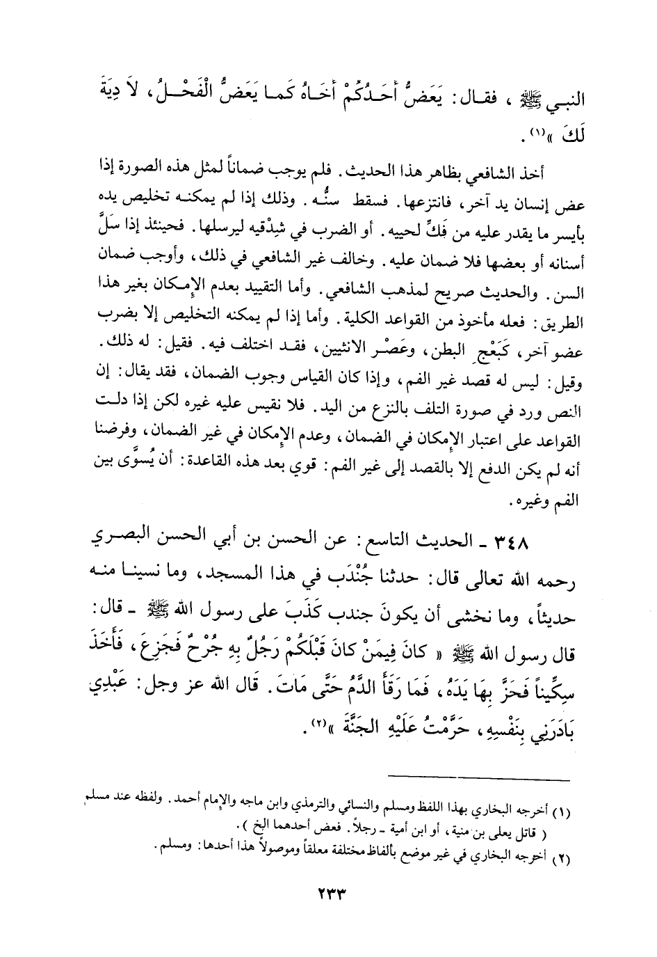 348 - الْحَدِيثُ التَّاسِعُ: عَنْ الْحَسَنِ بْنِ أَبِي الْحَسَنِ الْبَصْرِيِّ - رَحِمَهُ اللَّهُ تَعَالَى - قَالَ: حَدَّثَنَا جُنْدُبٌ فِي هَذَا الْمَسْجِدِ، وَمَا نَسِينَا مِنْهُ حَدِيثًا، وَمَا نَخْشَى أَنْ يَكُونَ جُنْدُبٌ كَذَبَ عَلَى رَسُولِ اللَّهِ - صَلَّى اللَّهُ عَلَيْهِ وَسَلَّمَ - قَالَ: قَالَ رَسُولُ اللَّهِ - صَلَّى اللَّهُ عَلَيْهِ وَسَلَّمَ - «كَانَ فِيمَنْ كَانَ قَبْلَكُمْ رَجُلٌ بِهِ جُرْحٌ فَجَزِعَ، فَأَخَذَ سِكِّينًا فَحَزَّ بِهَا يَدَهُ، فَمَا رَقَأَ الدَّمُ حَتَّى مَاتَ. قَالَ اللَّهُ عَزَّ وَجَلَّ: عَبْدِي بَادَرَنِي بِنَفْسِهِ، حَرَّمْت عَلَيْهِ الْجَنَّةَ» .
