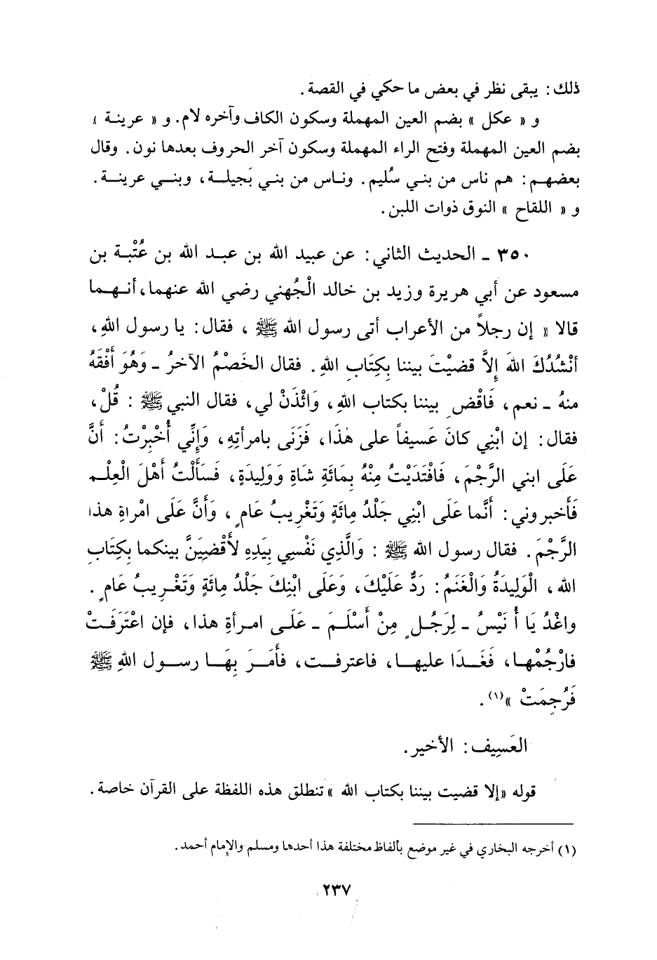 350 - الْحَدِيثُ الثَّانِي: عَنْ عُبَيْدِ اللَّهِ بْنِ عَبْدِ اللَّهِ بْنِ عُتْبَةَ بْنِ مَسْعُودٍ عَنْ أَبِي هُرَيْرَةَ وَزَيْدِ بْنِ خَالِدٍ الْجُهَنِيِّ - رَضِيَ اللَّهُ عَنْهُمَا -، أَنَّهُمَا قَالَا «إنَّ رَجُلًا مِنْ الْأَعْرَابِ أَتَى رَسُولَ - صَلَّى اللَّهُ عَلَيْهِ وَسَلَّمَ - فَقَالَ: يَا رَسُولَ اللَّهِ، أَنْشُدُك اللَّهَ إلَّا قَضَيْت بَيْنَنَا بِكِتَابِ اللَّهِ فَقَالَ الْخَصْمُ الْآخَرُ - وَهُوَ أَفْقَهُ مِنْهُ - نَعَمْ، فَاقْضِ بَيْنَنَا بِكِتَابِ اللَّهِ، وَأْذَنْ لِي، فَقَالَ النَّبِيُّ - صَلَّى اللَّهُ عَلَيْهِ وَسَلَّمَ -: قُلْ، فَقَالَ: إنَّ ابْنِي كَانَ عَسِيفًا عَلَى هَذَا، فَزَنَى بِامْرَأَتِهِ، وَإِنِّي أُخْبِرْت أَنَّ عَلَى ابْنِي الرَّجْمَ، فَافْتَدَيْت مِنْهُ بِمِائَةِ شَاةٍ وَوَلِيدَةٍ، فَسَأَلْت أَهْلَ الْعِلْمِ فَأَخْبَرُونِي أَنَّمَا عَلَى ابْنِي جَلْدُ مِائَةٍ وَتَغْرِيبُ عَامٍ، وَأَنَّ عَلَى امْرَأَةِ هَذَا الرَّجْمَ. فَقَالَ رَسُولُ اللَّهِ - صَلَّى اللَّهُ عَلَيْهِ وَسَلَّمَ -: وَاَلَّذِي نَفْسِي بِيَدِهِ لَأَقْضِيَنَّ بَيْنَكُمَا بِكِتَابِ اللَّهِ، الْوَلِيدَةُ وَالْغَنَمُ رَدٌّ عَلَيْك وَعَلَى ابْنِك جَلْدُ مِائَةٍ وَتَغْرِيبُ عَامٍ. وَاغْدُ يَا أُنَيْسُ - لِرَجُلٍ مِنْ أَسْلَمَ - عَلَى امْرَأَةِ هَذَا، فَإِنْ اعْتَرَفَتْ فَارْجُمْهَا، فَغَدَا عَلَيْهَا، فَاعْتَرَفَتْ، فَأَمَرَ بِهَا رَسُولُ اللَّهِ - صَلَّى اللَّهُ عَلَيْهِ وَسَلَّمَ - فَرُجِمَتْ» .