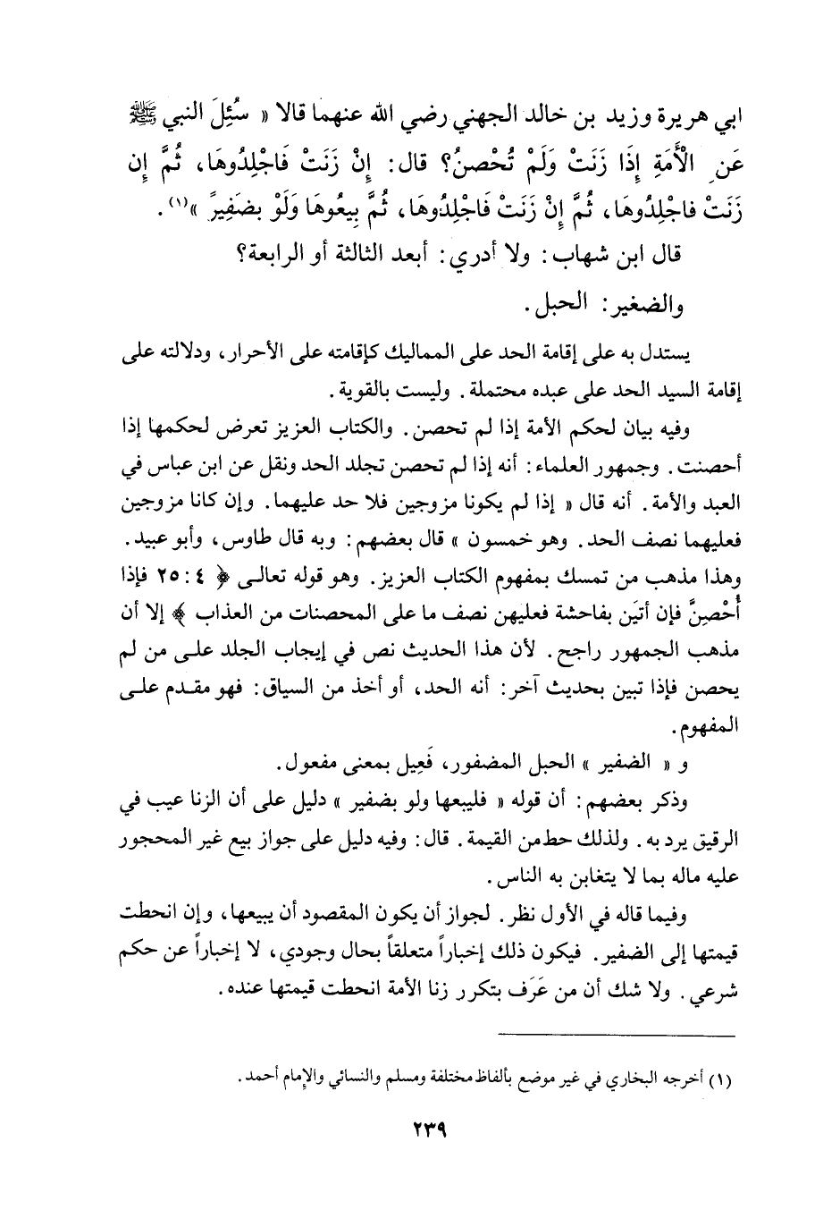 قَالَ ابْنُ شِهَابٍ: وَلَا أَدْرِي: أَبْعَدَ الثَّالِثَةِ أَوْ الرَّابِعَةِ؟ وَالضَّفِيرُ: الْحَبْلُ. يُسْتَدَلُّ بِهِ عَلَى إقَامَةِ الْحَدِّ عَلَى الْمَمَالِيكِ كَإِقَامَتِهِ عَلَى الْأَحْرَارِ، وَدَلَالَتُهُ عَلَى إقَامَةِ السَّيِّدِ الْحَدَّ عَلَى عَبْدِهِ مُحْتَمَلَةٌ وَلَيْسَتْ بِالْقَوِيَّةِ، وَفِيهِ بَيَانٌ لِحُكْمِ الْأَمَةِ إذَا لَمْ تُحْصَنْ. وَالْكِتَابُ الْعَزِيزُ تَعَرَّضَ لِحُكْمِهَا إذَا أُحْصِنَتْ، وَجُمْهُورُ الْعُلَمَاءِ: أَنَّهُ إذَا لَمْ تُحْصَنْ تُجْلَدُ الْحَدَّ، ونُقِلَ عَنْ ابْنِ عَبَّاسٍ فِي الْعَبْدِ وَالْأَمَةِ أَنَّهُ قَالَ " إذَا لَمْ يَكُونَا مُزَوَّجَيْنِ فَلَا حَدَّ عَلَيْهِمَا وَإِنْ كَانَا مُزَوَّجَيْنِ فَعَلَيْهِمَا نِصْفُ الْحَدِّ وَهُوَ خَمْسُونَ " قَالَ بَعْضُهُمْ: وَبِهِ قَالَ طَاوُسٌ، وَأَبُو عُبَيْدٍ وَهَذَا مَذْهَبُ مَنْ تَمَسَّكَ بِمَفْهُومِ الْكِتَابِ الْعَزِيزِ وَهُوَ - قَوْله تَعَالَى -: {فَإِذَا أُحْصِنَّ فَإِنْ أَتَيْنَ بِفَاحِشَةٍ فَعَلَيْهِنَّ نِصْفُ مَا عَلَى الْمُحْصَنَاتِ مِنَ الْعَذَابِ} [النساء: 25] إلَّا أَنَّ مَذْهَبَ الْجُمْهُورِ رَاجِحٌ؛ لِأَنَّ هَذَا الْحَدِيثَ نَصٌّ فِي إيجَابِ الْجَلْدِ عَلَى مَنْ لَمْ يُحْصَنْ، فَإِذَا تَبَيَّنَّ بِحَدِيثٍ آخَرَ أَنَّهُ الْحَدُّ، أَوْ أُخِذَ مِنْ السِّيَاقِ: فَهُوَ مُقَدَّمٌ عَلَى الْمَفْهُومِ. وَ " الضَّفِيرُ " الْحَبْلُ الْمَضْفُورُ، فَعِيلٌ بِمَعْنَى مَفْعُولٍ. وَذَكَرَ بَعْضُهُمْ: أَنَّ قَوْلَهُ " فَلْيَبِعْهَا وَلَوْ بِضَفِيرٍ " دَلِيلٌ عَلَى أَنَّ الزِّنَا عَيْبٌ فِي الرَّقِيقِ يُرَدُّ بِهِ، وَلِذَلِكَ حَطَّ مِنْ الْقِيمَةِ قَالَ: وَفِيهِ دَلِيلٌ عَلَى جَوَازِ بَيْعِ غَيْرِ الْمَحْجُورِ عَلَيْهِ مَالَهُ بِمَا لَا يَتَغَابَنُ بِهِ النَّاسُ. وَفِيمَا قَالَهُ فِي الْأَوَّلِ نَظَرٌ لِجَوَازِ أَنْ يَكُونَ الْمَقْصُودُ أَنْ يَبِيعَهَا وَإِنْ انْحَطَّتْ قِيمَتُهَا إلَى الضَّفِيرِ فَيَكُونُ ذَلِكَ إخْبَارًا مُتَعَلِّقًا بِحَالٍ وُجُودِيٍّ، لَا إخْبَارًا عَنْ حُكْمٍ شَرْعِيٍّ. وَلَا شَكَّ أَنَّ مَنْ عَرَفَ بِتَكَرُّرِ زِنَا الْأَمَةِ انْحَطَّتْ قِيمَتُهَا عِنْدَهُ.