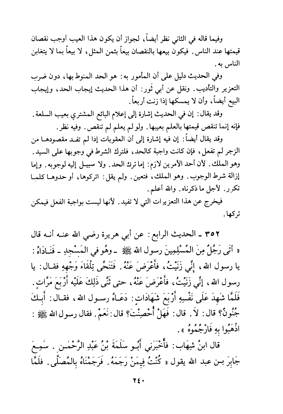 352 - الْحَدِيثُ الرَّابِعُ: عَنْ أَبِي هُرَيْرَةَ - رَضِيَ اللَّهُ عَنْهُ - أَنَّهُ قَالَ «أَتَى رَجُلٌ مِنْ الْمُسْلِمِينَ رَسُولَ اللَّهِ - صَلَّى اللَّهُ عَلَيْهِ وَسَلَّمَ - وَهُوَ فِي الْمَسْجِدِ - فَنَادَاهُ: يَا رَسُولَ اللَّهِ، إنِّي زَنَيْت، فَأَعْرَضَ عَنْهُ. فَتَنَحَّى تِلْقَاءَ وَجْهِهِ فَقَالَ: يَا رَسُولَ اللَّهِ، إنِّي زَنَيْت، فَأَعْرَضَ عَنْهُ، حَتَّى ثَنَّى ذَلِكَ عَلَيْهِ أَرْبَعَ مَرَّاتٍ. فَلَمَّا شَهِدَ عَلَى نَفْسِهِ أَرْبَعَ شَهَادَاتٍ: دَعَاهُ رَسُولُ اللَّهِ، فَقَالَ: أَبِكَ جُنُونٌ؟ قَالَ: لَا. قَالَ: فَهَلْ أُحْصِنْت؟ قَالَ: نَعَمْ. فَقَالَ رَسُولُ اللَّه - صَلَّى اللَّهُ عَلَيْهِ وَسَلَّمَ -: اذْهَبُوا بِهِ فَارْجُمُوهُ» . قَالَ ابْنُ شِهَابٍ: فَأَخْبَرَنِي أَبُو سَلَمَةَ بْنُ عَبْدِ الرَّحْمَنِ. سَمِعَ جَابِرَ بْنَ عَبْدِ اللَّهِ يَقُولُ " كُنْت فِيمَنْ رَجَمَهُ، فَرَجَمْنَاهُ بِالْمُصَلَّيْ، فَلَمَّا