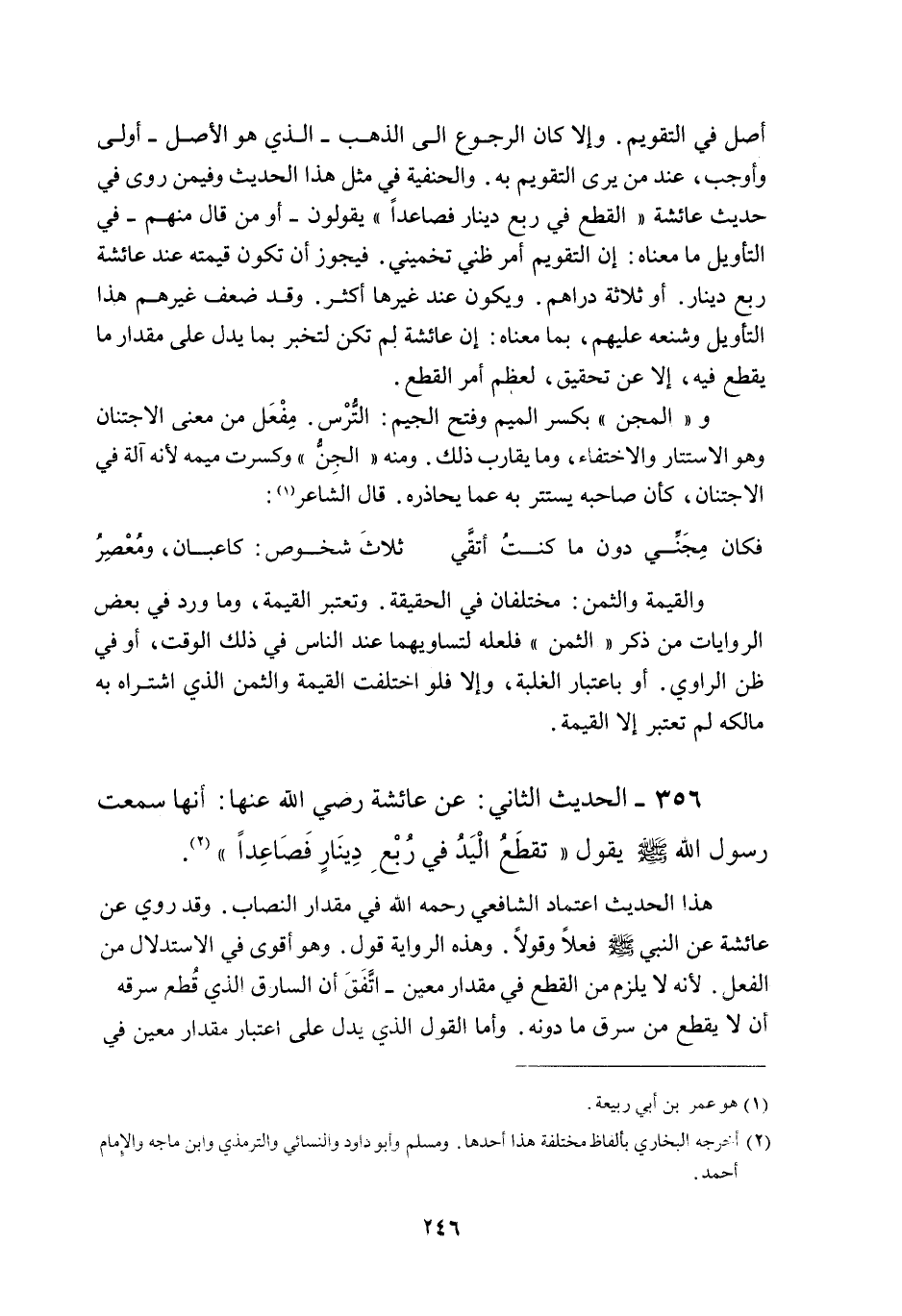 ـــــــــــــــــــــــــــــQأَصْلٌ فِي التَّقْوِيمِ وَإِلَّا كَانَ الرُّجُوعُ إلَى الذَّهَبِ - الَّذِي هُوَ الْأَصْلُ - أَوْلَى وَأَوْجَبَ، عِنْدَ مَنْ يَرَى التَّقْوِيمَ بِهِ. وَالْحَنَفِيَّةُ فِي مِثْلِ هَذَا الْحَدِيثِ وَفِيمَنْ رَوَى فِي حَدِيثِ عَائِشَةَ " الْقَطْعَ فِي رُبْعِ دِينَارٍ فَصَاعِدًا " يَقُولُونَ - أَوْ مَنْ قَالَ مِنْهُمْ - فِي التَّأْوِيلِ مَا مَعْنَاهُ: إنَّ التَّقْوِيمَ أَمْرٌ ظَنِّيٌّ تَخْمِينِيٌّ، فَيَجُوزُ أَنْ تَكُونَ قِيمَتُهُ عِنْدَ عَائِشَةَ رُبْعَ دِينَارٍ أَوْ ثَلَاثَةَ دَرَاهِمَ، وَيَكُونَ عِنْدَ غَيْرِهَا أَكْثَرَ. وَقَدْ ضَعَّفَ غَيْرُهُمْ هَذَا التَّأْوِيلَ وَشَنَّعَهُ عَلَيْهِمْ بِمَا مَعْنَاهُ: إنَّ عَائِشَةَ لَمْ تَكُنْ لِتُخْبِرَ بِمَا يَدُلُّ عَلَى مِقْدَارِ مَا يُقْطَعُ فِيهِ، إلَّا عَنْ تَحْقِيقٍ، لِعِظَمِ أَمْرِ الْقَطْعِ. وَ " الْمِجَنُّ " بِكَسْرِ الْمِيمِ وَفَتْحِ الْجِيمِ: التُّرْسُ، مِفْعَلٌ مِنْ مَعْنَى الِاجْتِنَانِ وَهُوَ الِاسْتِتَارُ وَالِاخْتِفَاءُ، وَمَا يُقَارِبُ ذَلِكَ، وَمِنْهُ " الْجِنُّ "، وَكُسِرَتْ مِيمُهُ؛ لِأَنَّهُ آلَةٌ فِي الِاجْتِنَانِ، كَأَنَّ صَاحِبَهُ يَسْتَتِرُ بِهِ عَمَّا يُحَاذِرُهُ. قَالَ الشَّاعِرُ: