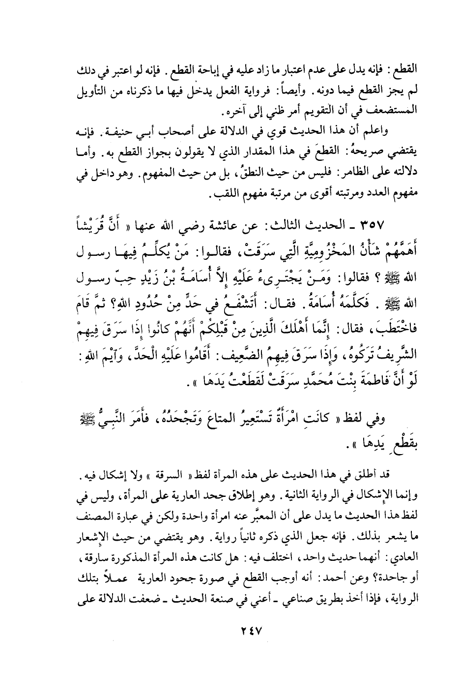 357 - الْحَدِيثُ الثَّالِثُ: عَنْ عَائِشَةَ - رَضِيَ اللَّهُ عَنْهَا - «أَنَّ قُرَيْشًا أَهَمَّهُمْ شَأْنُ الْمَخْزُومِيَّةِ الَّتِي سَرَقَتْ، فَقَالُوا: مَنْ يُكَلِّمُ فِيهَا رَسُولَ اللَّهِ - صَلَّى اللَّهُ عَلَيْهِ وَسَلَّمَ -؟ فَقَالُوا: وَمَنْ يَجْتَرِئُ عَلَيْهِ إلَّا أُسَامَةُ بْنُ زَيْدٍ حِبُّ رَسُولِ اللَّهِ - صَلَّى اللَّهُ عَلَيْهِ وَسَلَّمَ - فَكَلَّمَهُ أُسَامَةُ، فَقَالَ: أَتَشْفَعُ فِي حَدٍّ مِنْ حُدُودِ اللَّهِ؟ ثُمَّ قَامَ فَاخْتَطَبَ، فَقَالَ: إنَّمَا أَهْلَكَ الَّذِينَ مِنْ قَبْلِكُمْ أَنَّهُمْ كَانُوا إذَا سَرَقَ فِيهِمْ الشَّرِيفُ تَرَكُوهُ، وَإِذَا سَرَقَ فِيهِمْ الضَّعِيفُ أَقَامُوا عَلَيْهِ الْحَدَّ، وَاَيْمُ اللَّهِ: لَوْ أَنَّ فَاطِمَةَ بِنْتَ مُحَمَّدٍ سَرَقَتْ لَقَطَعْتُ يَدَهَا» .